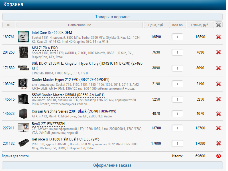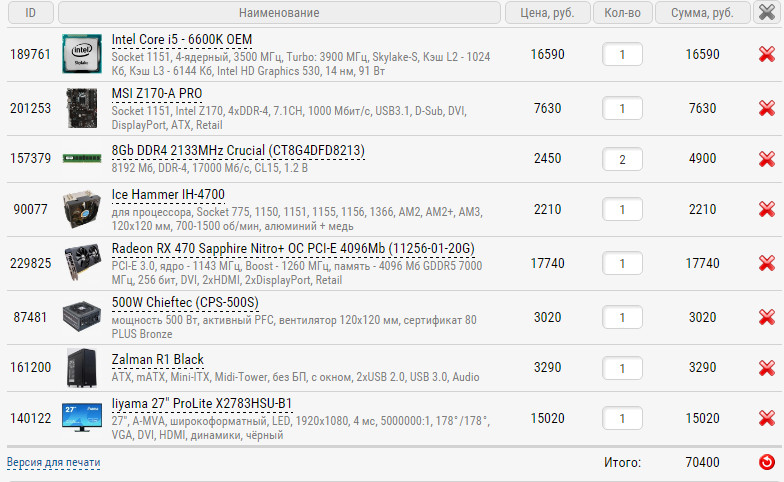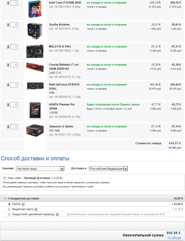 Видеокарта Palit GeForce GTX 1070 GameRock - http://technopoint.ru/product/0b2e764d3 ... 041g-sale/ в общую стоимость посчитал. БП точно хватит, больше избыточен будет. У i7 частота выше в бусте и потоков 8, думаю лучше будет.