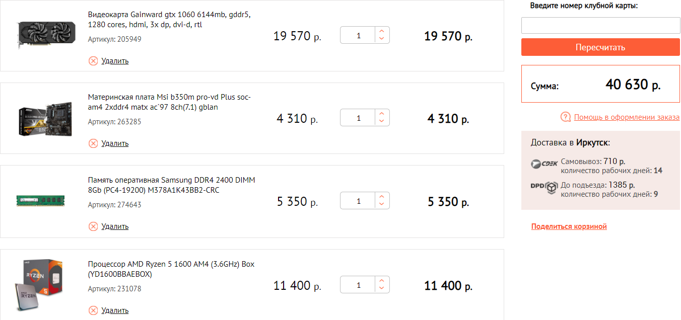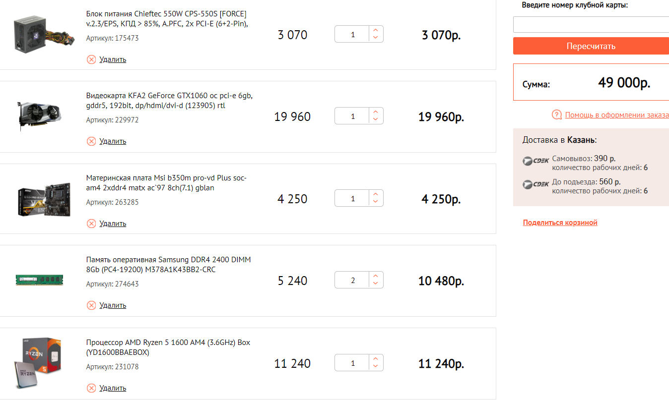 computeruniverse.ru AMD Ryzen 5 1600 6 core (Hexa Core) CPU with 3.20 GHz, Да 10721 MSI B350M PRO-VDH 4528 GIGABYTE Radeon RX 580 Gaming 4G 4.0 GB High End видеокарта 16975 Crucial CT8G4DFS8266 8GB DDR4 2666 C19 4927*2шт.=9854 но этот вариант уже ближе к 45к с учётом доставки