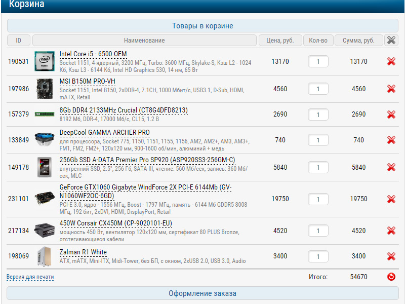 1) 50-55 тыс. руб. 2) https://www.computeruniverse.ru и http://bagiracomp.ru/ гор. Орёл. 3) Только системник. 4) Для современных ААА игр с близкими к максимальным настройками графики в разрешении FullHD. 5) Разгон не планирую. Ну может только видеокарты штатными средствами. 6) Апгрейд системы планирую не раньше, чем через 2-3 года. 7) Системник собираю с 0. 8) ЦП от Intel. Видеокарта от Nvidia. Корпус системного блока белого цвета. 9) Наброски конфигурации ПК (за основу брал готовую конфигурацию из соседней темы "Конфигурации игровых системных блоков") ЦП: Intel Core i5-6500 Мат. плата: MSI B150M PRO-VDH Кулер: DeepCool Gammaxx 400 ОЗУ: 8Gb 2133MHz CL15 1.2V Kingston (KVR21N15D8/8) ЖД: 1Tb Seagate ST1000DM003 Видеокарта: Palit Nvidia GTX 1060 6Gb Dual БП: Enermax Max Pro 600 Корпус: Zalman R1 ATX White