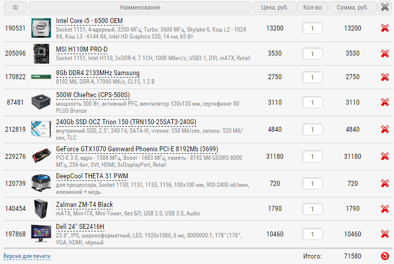 Получилось больше 70. Вроде как много не сэкономишь, монитор хуже брать не стоит, БП тоже, хотя можно сэкономить пару тысяч найдя Cooler Master G550, можно отказаться от SSD, докупить его потом.