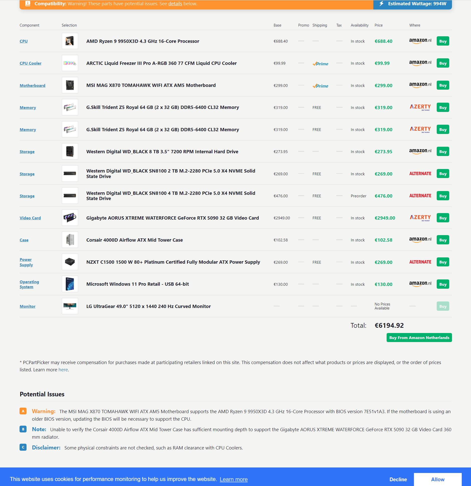 CPU: AMD Ryzen 9 9950X3D 4.3 GHz 16-Core Processor CPU COOLER: ARCTIC Liquid Freezer III Pro A-RGB 360 77 CFM Liquid CPU Cooler MOTHERBOARD: MSI MAG X870 TOMAHAWK WIFI ATX AM5 Motherboard MEMORY: G.Skill Trident Z5 RGB 48 GB (2 x 24 GB) DDR5-8400 CL40 x2 kits STORAGE: - HDD: Seagate BarraCuda Pro 12 TB 3.5" 7200 RPM Internal Hard Drive - SSD 1: Samsung 990 Pro 4 TB M.2-2280 PCIe 4.0 X4 NVME - SSD 2: Western Digital WD_BLACK SN8100 2 TB M.2-2280 PCIe 5.0 X4 NVME VIDEO CARD: Asus ROG Astral OC GeForce RTX 5090 32 GB POWER SUPPLY: Corsair HX1500i (2023) 1500W 80+ Platinum Certified Fully Modular ATX OS: Microsoft Windows 11 Pro Retail - USB 64-bit MONITOR: LG UltraGear 49.0" 5120 x 1440 240 Hz Curved Monitor CASE: HYTE Y70 Touch Infinite ATX Mid Tower Case