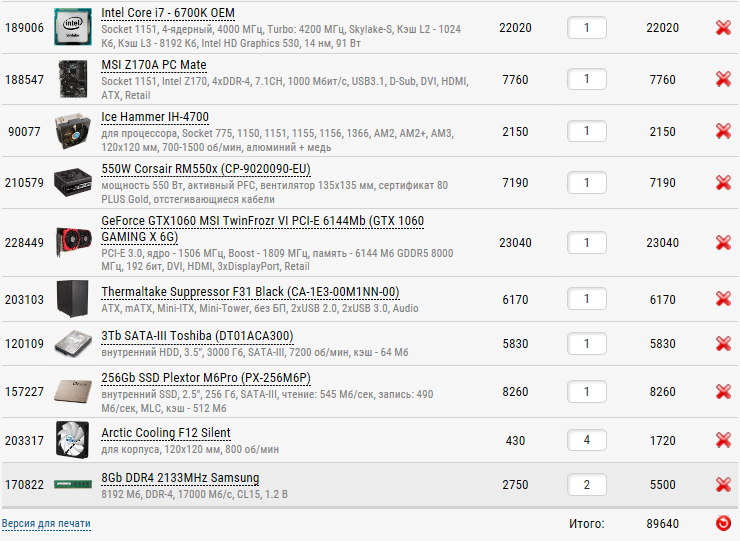 Вот это уже отличный набросок. Нюансы: - ССД неоправданно дорогой, есть http://www.regard.ru/catalog/tovar212819.htm и http://www.regard.ru/catalog/tovar212958.htm (480Gb за те же деньги; можно взять и ЖД на 5900rpm, так как все требующее производительности влезет на ССД). - У матплаты три канала управления вентиляторами, для управления >3 вентиляторами нужен разветвитель http://www.coolera.ru/tovar.php?tovar=13193. Кроме того, трех вентилей даже для GTX 1070 хватило бы. Ну и менять штатные надо только если они плохие, в чем я не уверен.