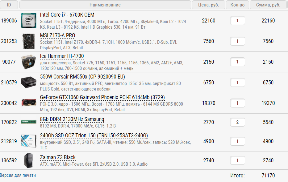 Здравствуйте! Прошу помочь со сборкой. 1) Бюджет - 70 тысяч, при надобности смогу добавить еще в разумных пределах. 2) http://computeruniverse.ru, что-то не особо дорогое (например, кулер, если на CU нет нужного) можно докупить в http://citilink.ru 3) Нужен только системный блок. 4) Беру для игр, работы (пока IntelliJ IDEA, Xcode, в будущем может что-то еще прибавится). Соответственно, буду ставить Hackintosh, но немного позже. Все в формате FullHD, ультра графика не нужна, хватит и высоких, средне-высоких. 5) Планирую разогнать года через 3. 6) Апгрейд в ближайшие 6 месяцев не планирую. 7) Железа нет, кроме периферии. 8) * Хотелось бы лет 5-7 не менять ничего за исключением видеокарты, которую я поменяю года через 2-3. * Совместимость с Hackintosh (https://www.tonymacx86.com/buyersguide/october/2016), хотя в моем варианте совместимо должно быть в любом случае, подходят и процессор, и любая материнская плата на Z170. Но все же, пожалуйста, посмотрите, есть ли она там в списке. С видеокартой можно особо не заморачиваться, буду сидеть в маке на HD530, мне хватит. 9) Процессор i7 6700k, видеокарта GTX 1060, присматриваюсь к Palit GTX 1060 Super JetStream. Можно рассмотреть и RX480, если она реально лучше для Windows (карту от Sapphire некоторые даже в Sierra запустить смогли, но пришлось повозиться. Опять же мне не принципиально, Mac OS нужен только для Xcode). SSD на 240-260 гб, HDD на 1 тб, RAM 16 гб.