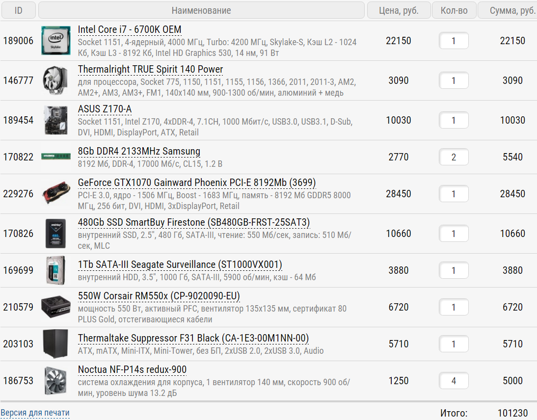 Как вариант сборки с процем i7-6700K - быстрее и даст возможность сделать апгрейд видеокарты на более производительную. Palit Jetstream/Gainward одна из лучших видеокарт с прекрасной и тихой СО. По Регарду: