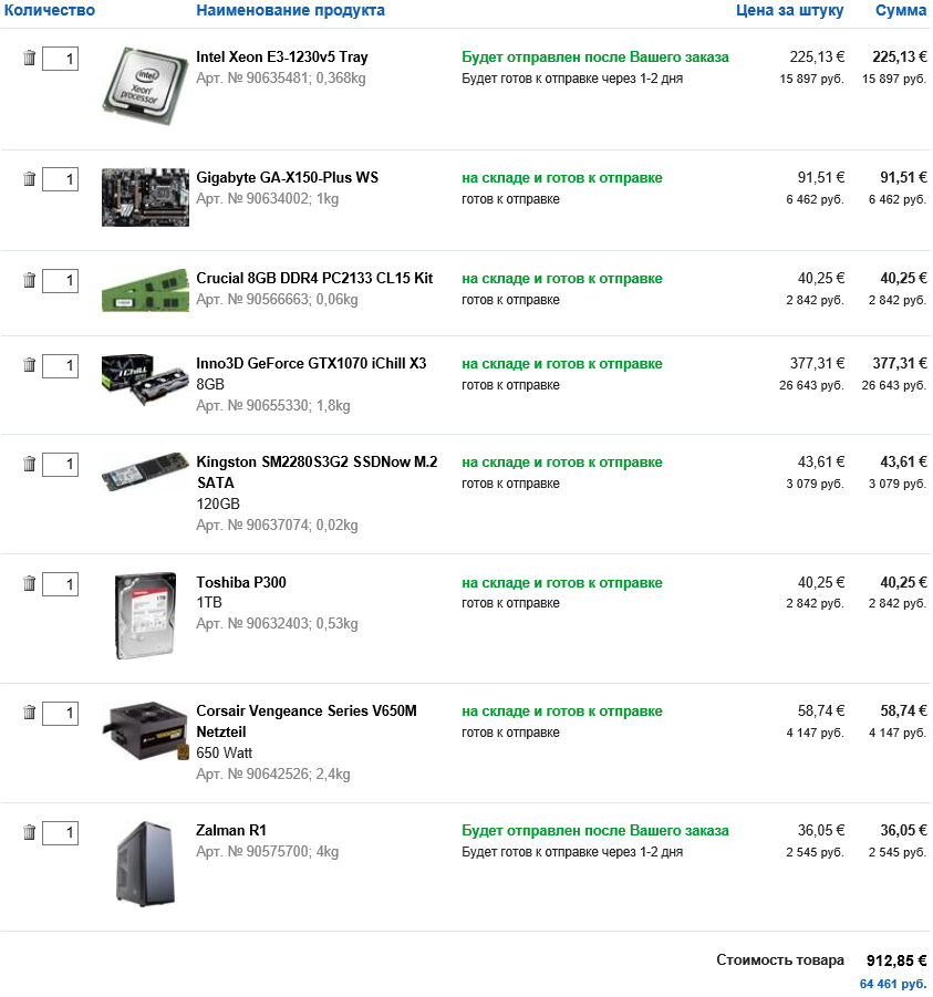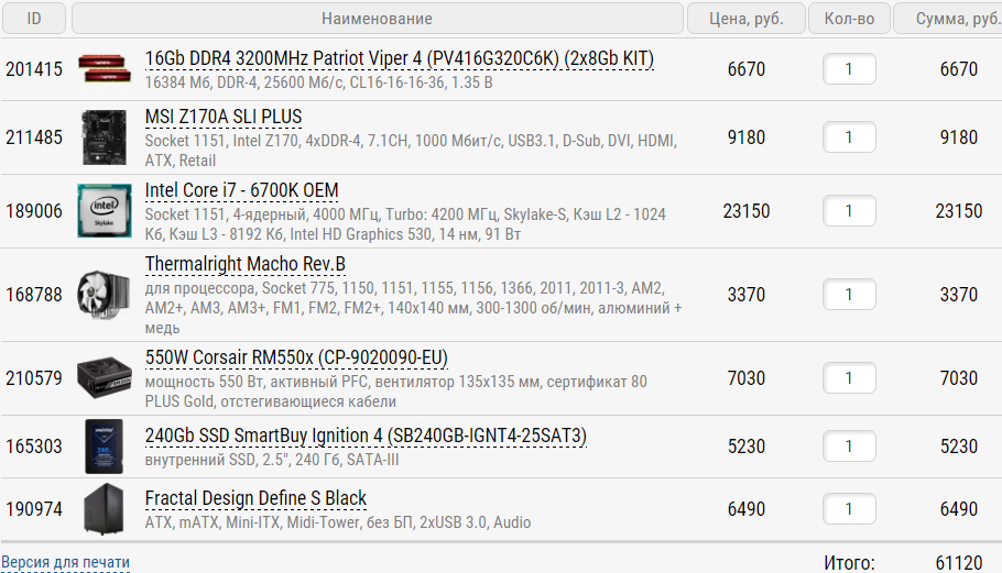 Здравствуйте! Прошу Вашей оценки выбора, может заменить что. 1. Бюджет максимум 65 тыщ.руб. Екатеринбург. 2. Планируется закупаться в Сутулинке. 3. Собираю только системник на 1151 сокете и z-170 4. Для игр в основном (батла, титанфол и прочее) 5. Разгон без фанатизма планируется, но не сразу 6. нет 7. нет 8. нет 9. а.Процессор Intel Core i5-6600K Skylake (3500MHz, LGA1151, L3 6144Kb) – 18000 р б. Видеокарта - GIGABYTE GeForce GTX 960 1216Mhz PCI-E 3.0 4096Mb 16000 р Или GIGABYTE GeForce GTX 1060 1620Mhz PCI-E 3.0 3072Mb – 18000 р (прошу помощи в выборе) в. Материнкая плата ASUS Z170-A – 10000 р (или MSI ?) г. Память DDR4 (2*8) 2666 (выбирал с оф сайта Асус по матери) Kingston HX426C15FBK2/16 – 7200 р или Corsair CMK16GX4M2A2666C16 – 6500 р д. Хард Kingston SHSS37A/120G SSD – 4500 р + Western Digital WD10EZRZ 1Тб – 3300 р е. БП AEROCOOL Strike-X 600, 600Вт или AeroCool VX700 700W или Zalman ZM700-LE II 700W (прошу помощи в грамотном подборе) в районе 4000 р ж. Корпус Thermaltake Versa N23 CA-1E2-00M1WN-00 Black или AeroCool LS-5200 Black или ZALMAN Z3 Plus (больше склоняюсь к последнему) з. В наличии Deepcool GAMMAXX 400