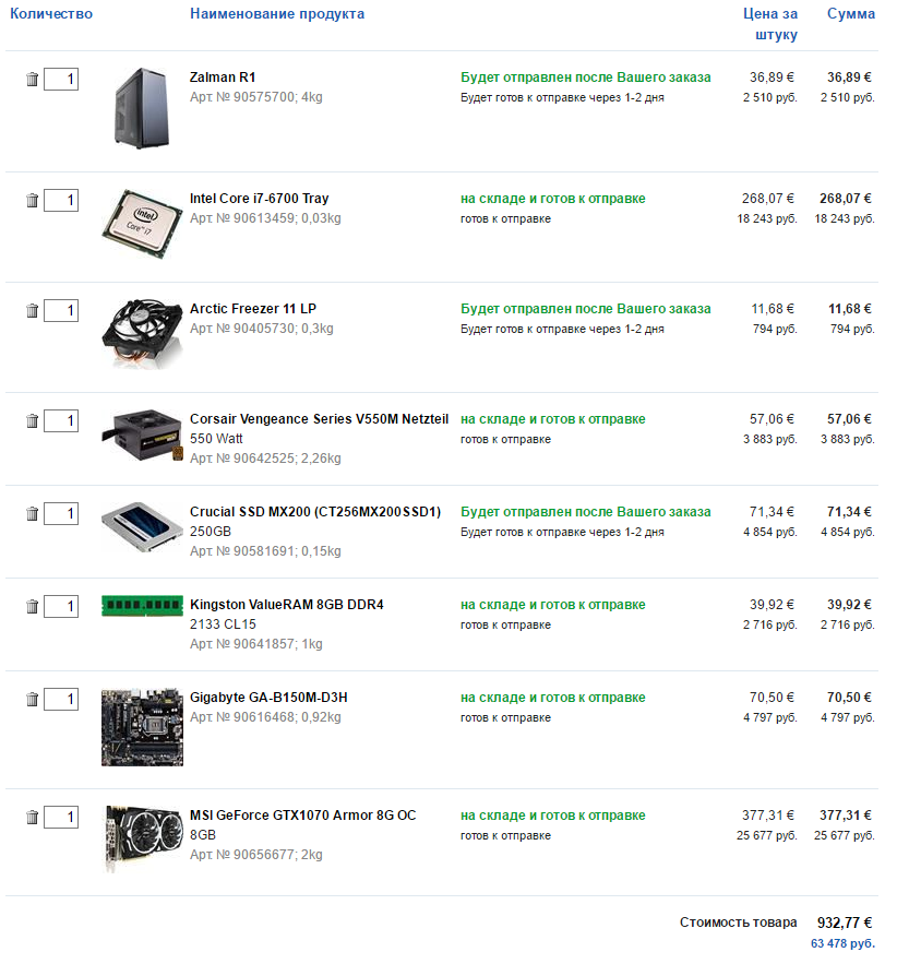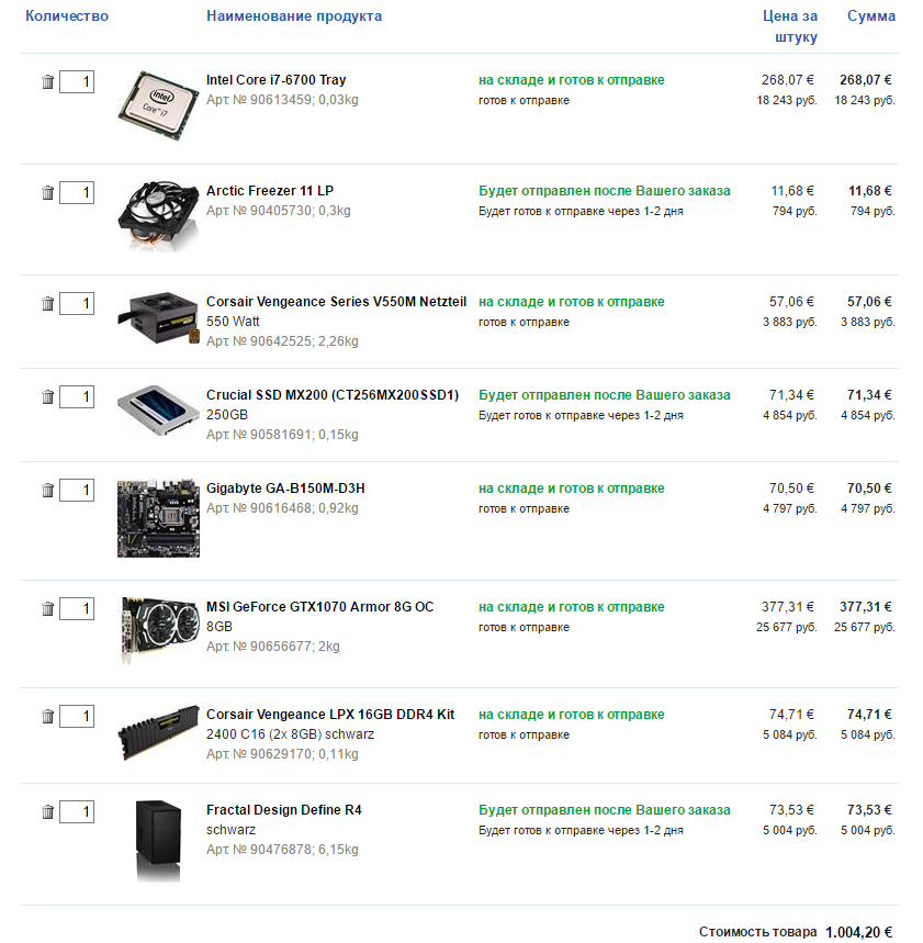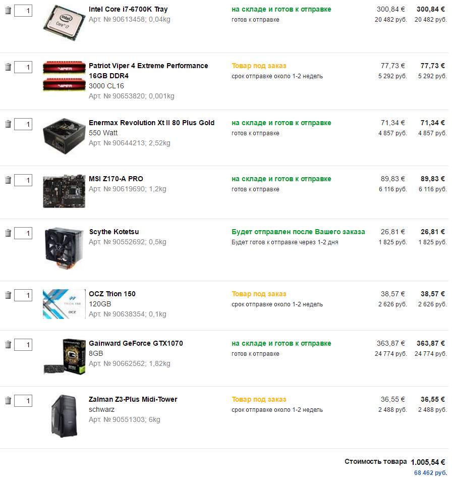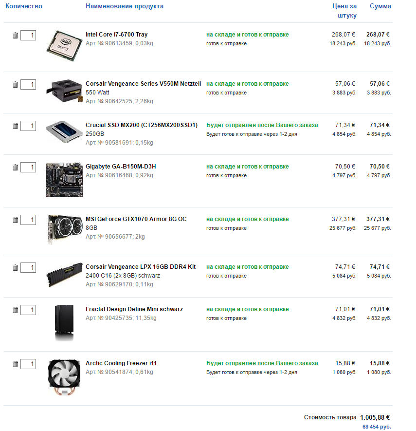 1) 61000 рублей, чисто на комплектуху (если надо еще постараюсь найти) 2) https://www.computeruniverse.ru/groups/ ... onents.asp 3) Только системник (без двд-привода) 4) Для игр (Ведьмак 3, GTA V, Battlefield 1 и 4) в 1080р, от 60фпс, макс. настройки 5) Рассматриваю возможность разгона 6) апгрейд не планируется 2-3 года 7) Есть HDD 5400rpm под файловоую помойку 8) Шума хочется поменьше, необязательно 9) Наброски конфигурации ПК: i7 + gtx 1070 + SSD 240GB
