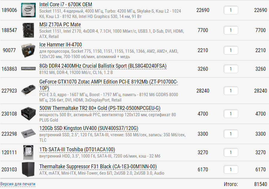 добрый день уважаемые. прошу помощи в сборе системника. собирать буду в СПб ситилинк или юлмарт (можно и CU но не увидел большой экономии да и доставка напрягает). бюджет 80 к. разгон умеренный, апдейт не ранее 3-5 лет. направление игры БФ, ведьмак, скайрим. монитор 24 HD в мечтах : проц 6700 видео 1070 ссд 240 и 1-2 Тб хдд память 16-32 гб корпус не нужен БП ? мать ? кулер ?