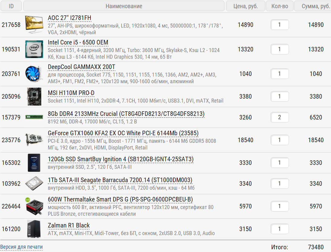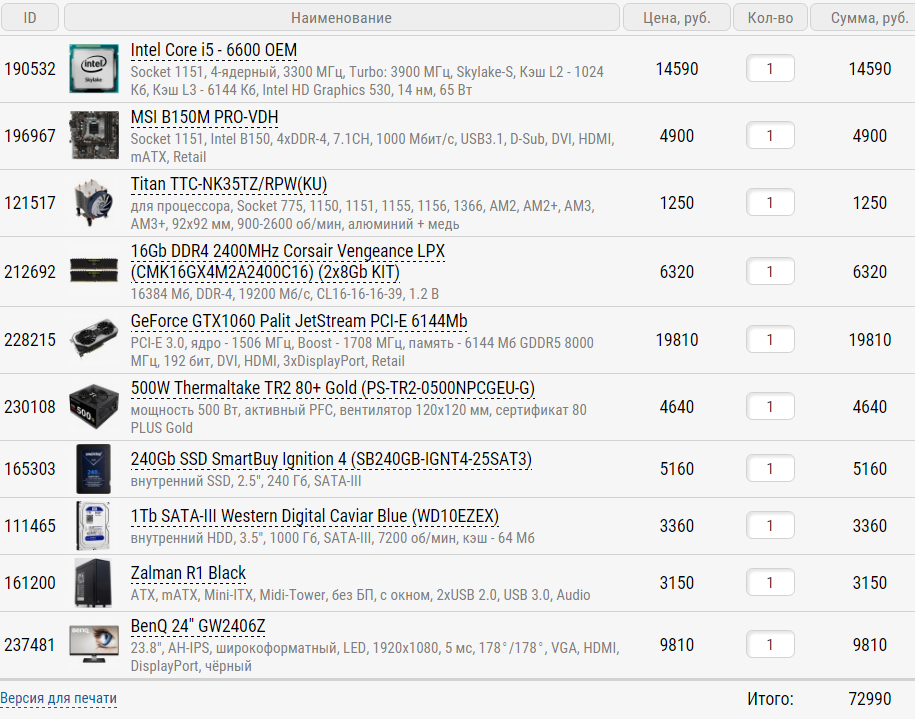 1. 60000 рублей - это на непосредственно ПК, монитор и периферию (клавиатура, мышь, колонки) 2. Город Казань, магазины: [url="https://www.ulmart.ru/"]Юлмарт[/url], [url="http://technopoint.ru/"]Технопоинт[/url], [url="http://www.citilink.ru/"]Ситилинк[/url], [url="http://kazan.nix.ru/"]Никс[/url] и можно другие 3. Задачи для чего покупается ПК: Компьютер на 90% для игр и 10% для учёбы и примитивной офисной работы 4. Разгон не планируется, но если очень надо, то 5. В ближайшие года 4 апдейт не планируется 6. Шум не имеет значение, предпочтение видеокартам nvidia