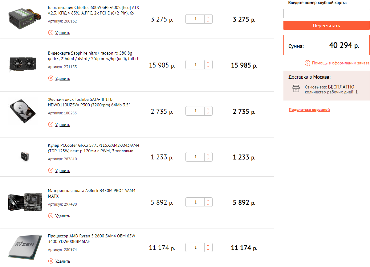 kiro1245 technopoint Процессор AMD Ryzen 5 1600 BOX 10999 Материнская плата GIGABYTE GA-AB350M-DS3H V2 4550 Оперативная память Crucial [CT8G4DFD824A] 8 ГБ 4250*2=8500 2 ТБ Жесткий диск Seagate BarraCuda [ST2000DM008] 4550 500 ГБ SSD-накопитель Samsung 860 EVO [MZ-76E500BW] 7499 Корпус Zalman Z1 NEO черный 3099 Блок питания Cougar STX650 [STX650] 3699 итого 42896 если нужно именно 40к, то ssd на 240 гБ из той же серии.