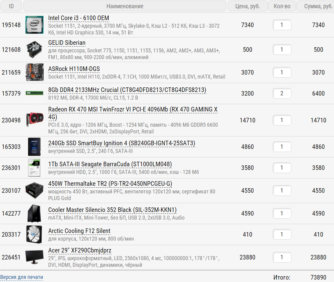 Приветствую всех! Друже, возникла необходимость приобрести четыре однотипные машины для работы и, возможно, несложных игрушек в свободное время. Машины берутся юридическим лицом, поэтому зарубежные магазины (типа CU) к сожалению, отпадают. Брать будем в интернете с доставкой до нашего населенного пункта. Также отпадает вариант с "подождать каби лейк или дзен". 1) 80000 руб., но лучше чуть меньше, дабы оставить место для маневра и доставки (может около 3 - 4 тысяч). 2) Регард или иной магазин, который может выглядеть предпочтительнее. 3) Системник, монитор и периферия (мышь и клавиатура). 4) Офисные задачи (компьютеры для фирмы), ничего сверхвыдающегося, иногда игры в разрешении FHD. 5) Разгон не планируется. 6) Апгрейд не планируется. 7) Ничего нет, все приобретается "с нуля". 8) Небольшие размеры и уровень шума. 9) Здесь примерная конфигурация по Регарду без мыши и клавиатуры - клавиатура с полноценной клавишей "Enter", мышь - с двумя боковыми кнопками под большой палец, по моделям - что подскажете?