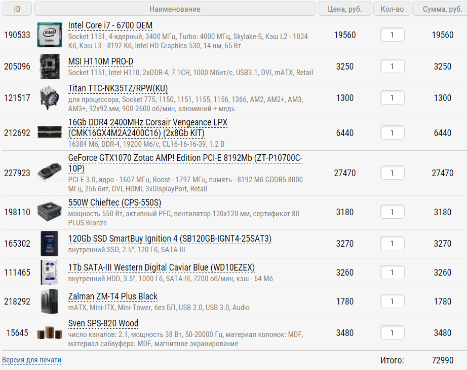 Под ваши задачи можно собрать так по Технопоинту и увеличить бюджет на монитор - https://www.ulmart.ru/goods/3966269, либо снизить аппетит и собрать систему без разгона (i7-6700 + H110M + DeepCool THETA 31 PWM).