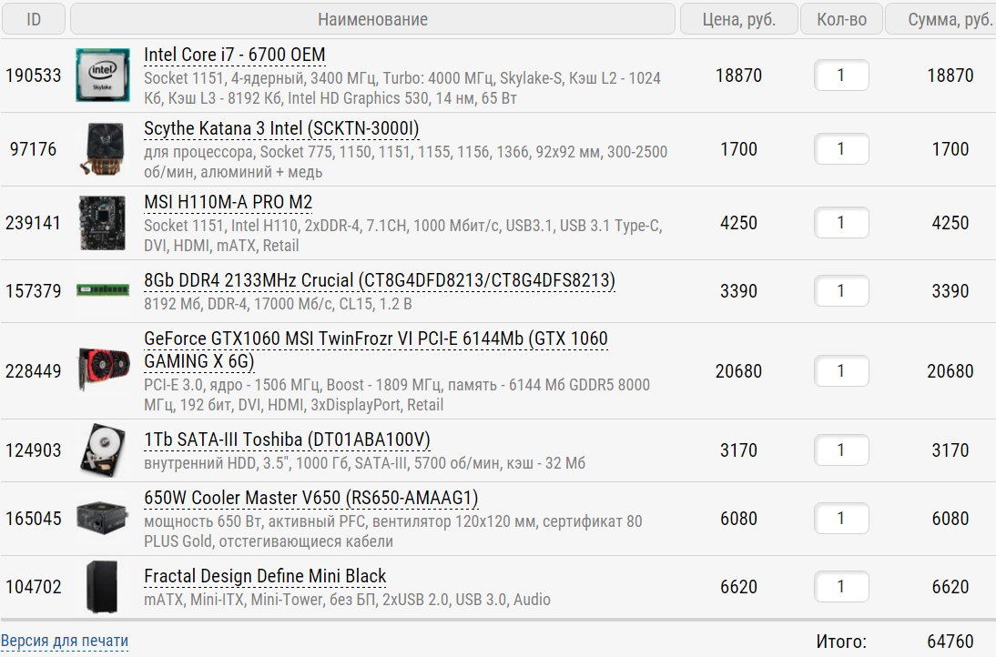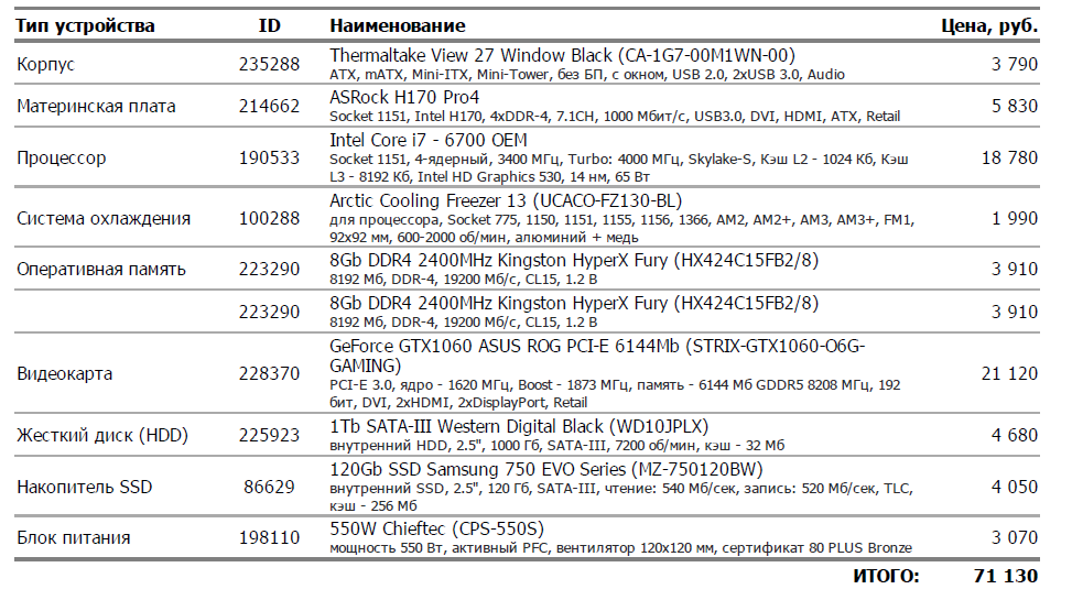 Господа, не проходите мимо! 1) 1000$ (63000р.) 2) планирую собрать на Regard.ru, Москва. 3) беру только системный блок 4) ПК для игр преимущественно жанров FPS, MOBA, MMORPG ТАКЖЕ для работы в аудио-секвенсорах (Cubase, FL, умеренное кол-во плагинов) для записи и живой игры ч/з внешнюю саундкарту (есть, Roland TRI-CAPTURE) 5) Разгонять в ближайший год не планируется 6) Планирую докупить + 8 оперативки и SSD через пару месяцев после покупки ПК 8) ПК хочу на базе intel, т.к. привык с ними работать - Тишина довольно существенна - ATX - Производительность видеокарты от GTX 970, - Планирую долго использовать этот ПК как базу для дальнейших апгрейдов на долгие годы, поэтому думаю, что нужна хорошая материнская плата (могу ошибаться) - Уже есть внешняя саундкарта Roland Tri-Capture, качество аудио на материнской плате не волнует (если можно для обработки звука полностью использовать внешнюю) - Для работы со звуком нужен процессор с хорошим Single Thread Performance. 9) Есть следующий набросок без дополнительной RAM (8/16) и SSD Проц - Intel Core i7-6700 Skylake (3400MHz/LGA1151/L3 8192Kb) Видяха - ASUS GeForce GTX 1060 1620Mhz PCI-E 3.0 6144Mb 8208Mhz 192 bit DVI HDMI HDCP ROG STRIX-GTX1060-O6G-GAMING Оперативка 8гб Kingston HyperX Fury Black DDR4 DIMM 2400MHz PC4-19200 CL15 - 8Gb KIT HX424C15FB/8 Материнка - ASRock H170 Pro4 HDD - 1Tb - Western Digital Black WD10JPLX Кулер - Arctic Cooling Freezer 13 UCACO-FZ130-BL БП - Chieftec CPS-550S 550W Корпус - Thermaltake Suppressor F31 Black Итого цена на Регарде: 65,330
