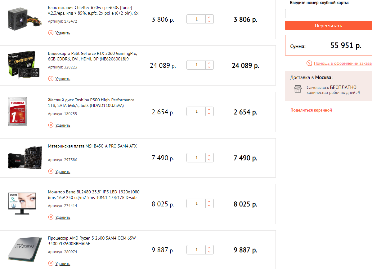 Благодарю). Прошу извинить, появилась возможность чуток бюджет поднять. Если не затруднит, прошу помощи) 1) ~55к. 2) г. Миасс, https://technopoint.ru, https://www.citilink.ru, https://www.dns-shop.ru. 3) Только системник. 4) Монитор - старенький Samsung SyncMaster P2050 1600x900, 60hz. Для игр типа Batman Arkham Knight, Dark Souls, Fortnite на средних/высоких+новинки. 5) Разгона не будет. 6) Апгрейд - скорее нет, чем да. 7) Нет 8) Разницы нет. И, если возможно, все с 1 магазина.