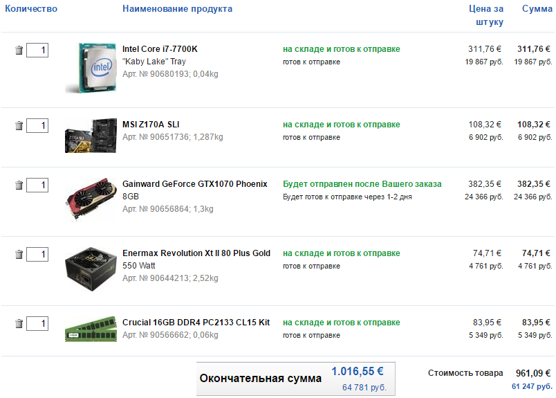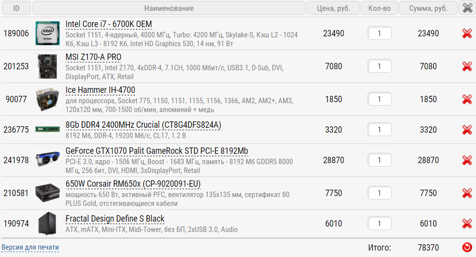1) 80000 рублей. 2) Computeruniverse 3) Ситемник 4) а)Для игровых систем: б) Для систем, на которых будет слушаться Музыка 5) Разгон планируется до 4,5-4,7 в зависимости от того как повезет с процессором. Видеокарта и оперативка так же разгон возможен. 6) Апгрейд не планируется в ближайшие 2-3 года. 8) Требования: Умеренный разгон, тихий. 9) Мои наброски конфигурации ПК: 1.Корпус: NZXT s340. 2.Материнская плата: ASUS Z170 PRO Gaming или Aura. 3.Процессор: Intel Core i7-6700K Tray или Intel Core i7-7700K Tray. Разница, как я понимаю всего 1000 рублей. 4.Видеокарта: MSI GeForce GTX1070 Gaming X 8G 8.0 GB OC Enthusiast. 5.Оперативная память: Kingston HyperX FURY Black DDR4 Kit 2666MHz 16GB (2x8GB). 6.Кулер: Thermalright HR-02 Macho X2 или Thermalright HR-02 Macho Rev. B. 7.Блок питания: Не знаю какой выбрать по соотношению цена/качество для данной системы. Без излишков но что бы не гудел от перенапряжения. 8.SSD: На 120GB Не дорогой но надежный и быстрый. 9.HDD: WD Blue Desktop WD10EZEX 1TB
