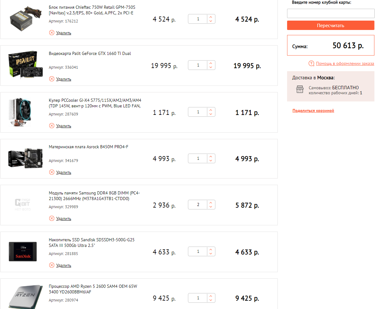 CPU AMD Ryzen 5 2600 OEM 9450 GPU Palit GeForce GTX 1660 Ti StormX OC 17998 MB GIGABYTE GA-AB350M-DS3H V2 3845 DDR G.SKILL F4-3000C16D-16GISB 6502 SSD Sata M2 WD BLUE 500 GB 4500 БП be quiet! System Power 9 600W 3765 Cooler Deepcool GAMMAXX 300 R 1282 Итого 47342