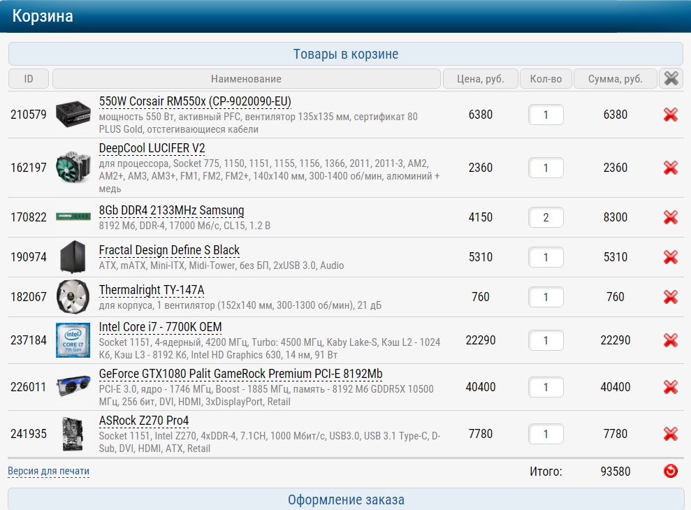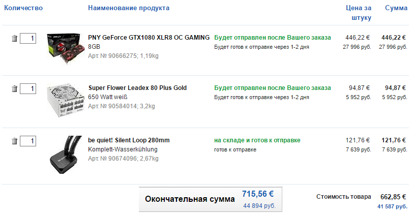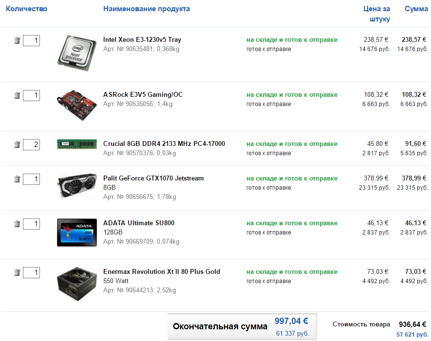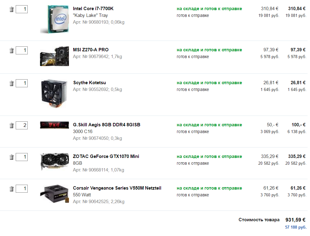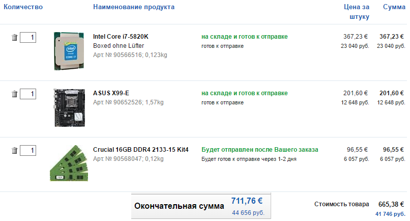 Если заказывать на ComputerUniverse, то вся эта сборка без терабайтного HDD (его заказывать не буду чтоб не стрясли) и кулера Titan (его там нет) будет стоит 52к.
