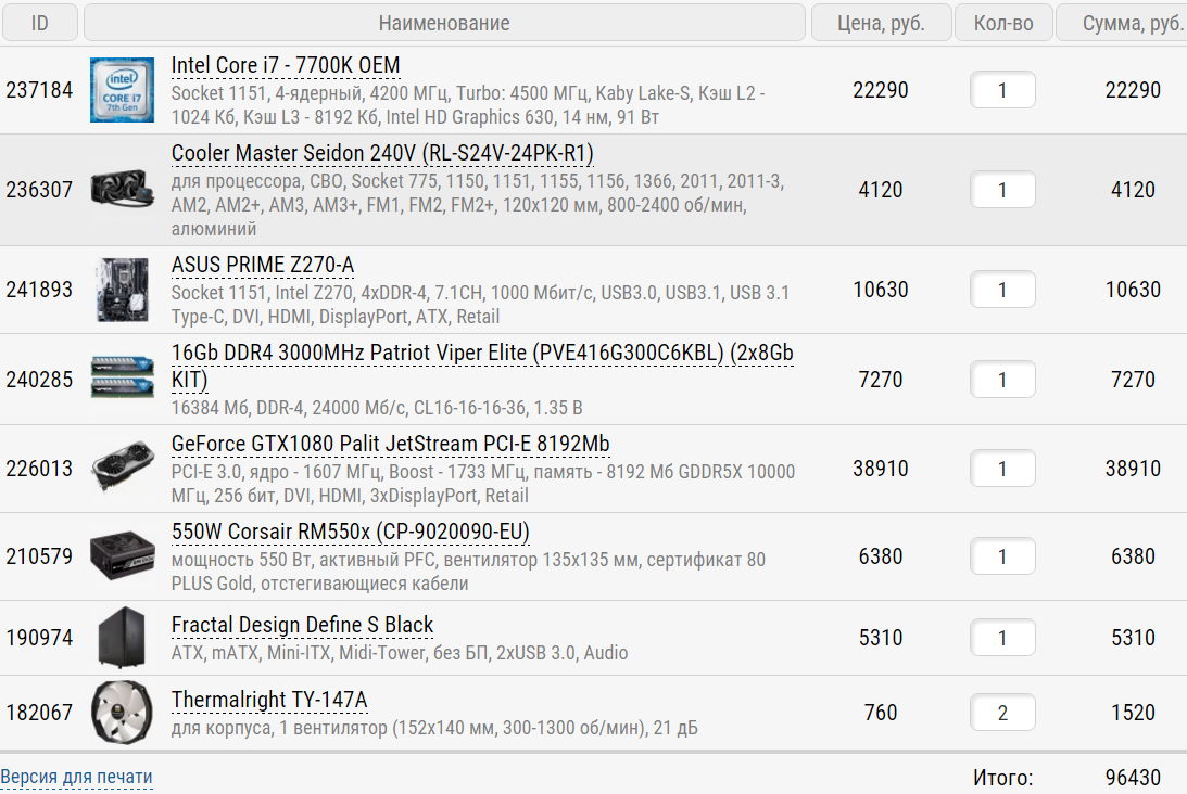 Добрый день! 1) Бюджет 95к. 2) Москва, regard.ru (но можно и в нескольких магазинах) если стоящей позиции нету в данном магазине. 3) Только системник. 4) Под игры в фулл хд ( современные шутеры + wow). 5) Если разгон заключается в применении в биосе нескольких твиков, то разгон нужен. Если при этих манипуляциях процессор станет работать быстрее. 6) Апгрейд не планируется. 7) Есть ssd samsung 256gb, винт на террабайт, монитор AOC i2481FXH - это покупать не нужно. 8) Красота, шумность системы - не важны. Интересует чисто практичность. Конфиг, который накидал во вложении. Где что добавить/урезать? Как понимаю цены на 1080 должны начать падать, готов купить конфиг без видео, тогда. И подождать недели 3-4.