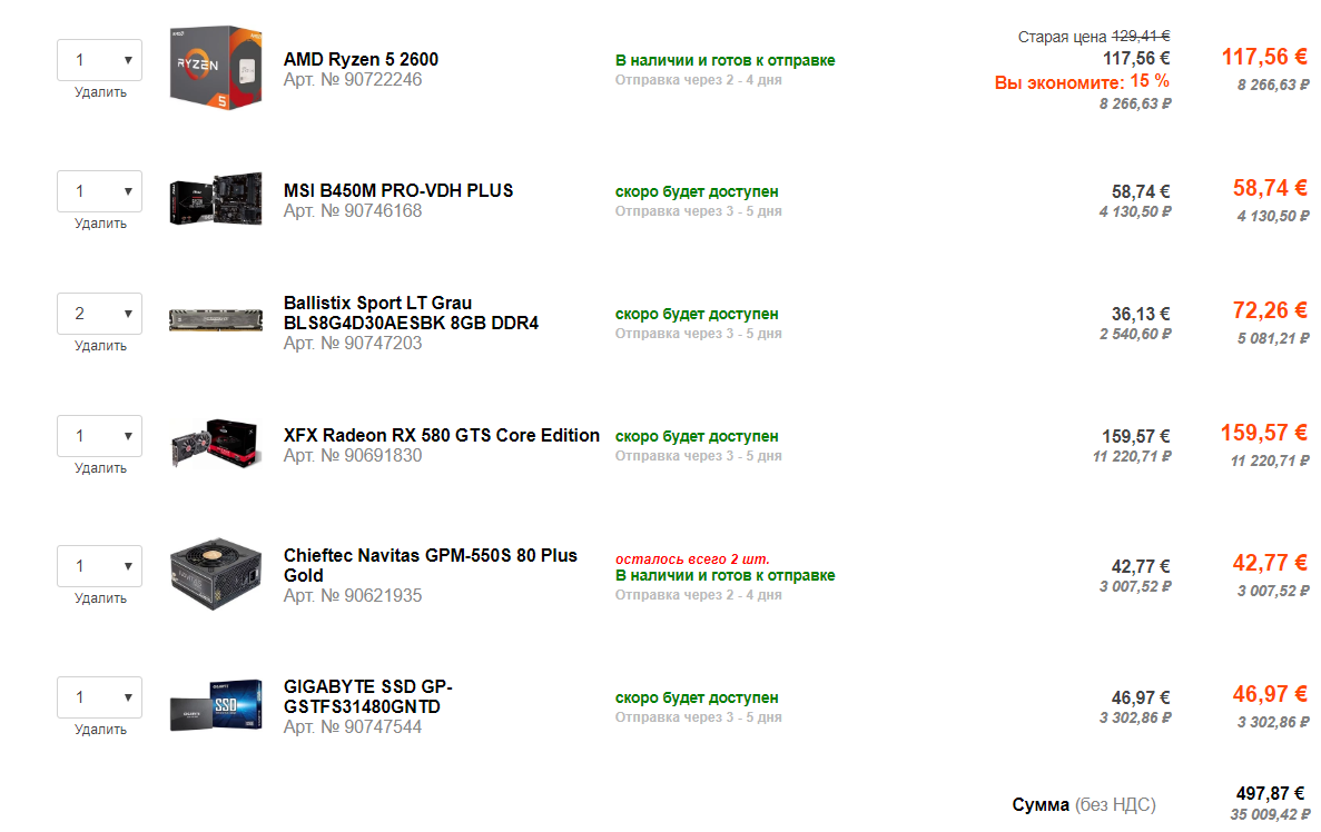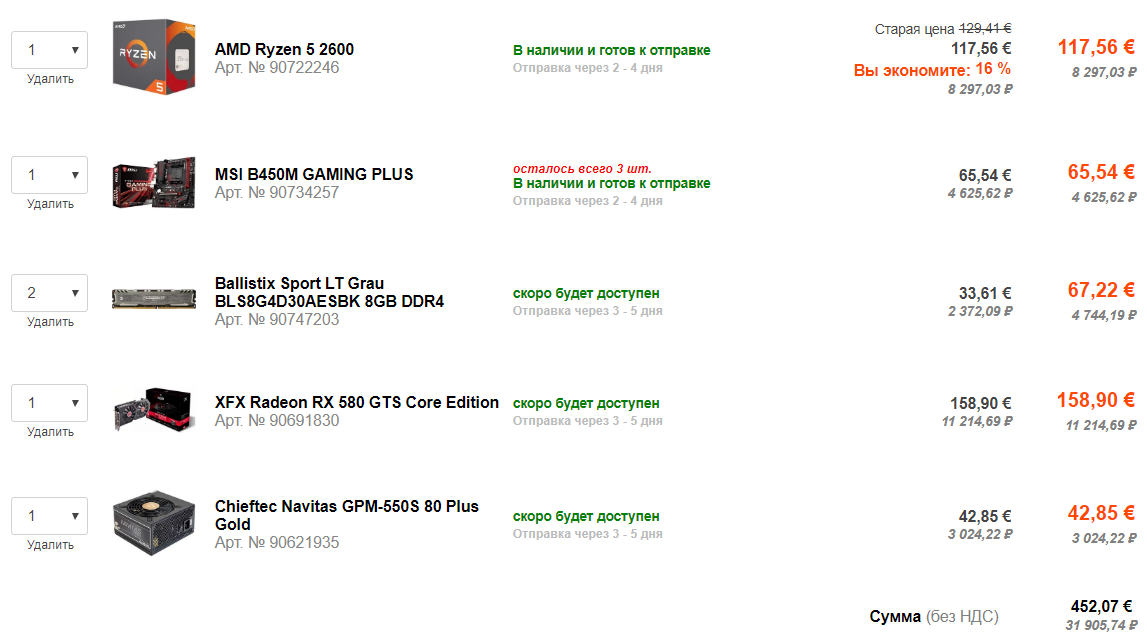 Patriot Viper 4 Extreme Performance 16GB DDR4 Chieftec Navitas GPM-550S 80 Plus Gold AMD Ryzen 5 2600 XFX Radeon RX 580 GTS Core Edition GIGABYTE B450 AORUS M По цене выходит ~32500 + доставка 2500. Как раз укладываюсь в бюджет 35к. Ну и корпус позже куплю ZALMAN n2, и куллер gammax 300.