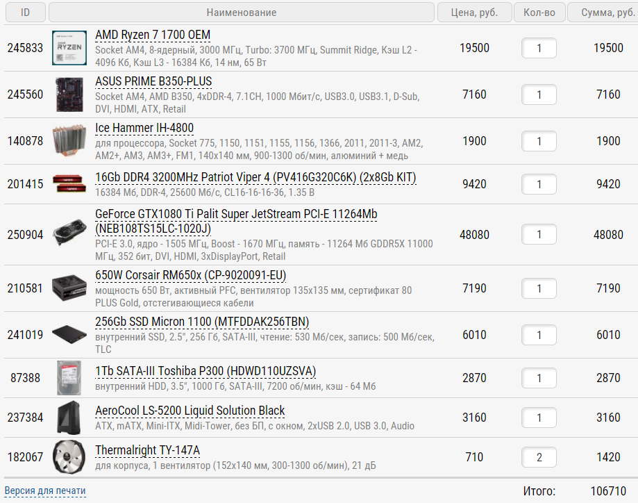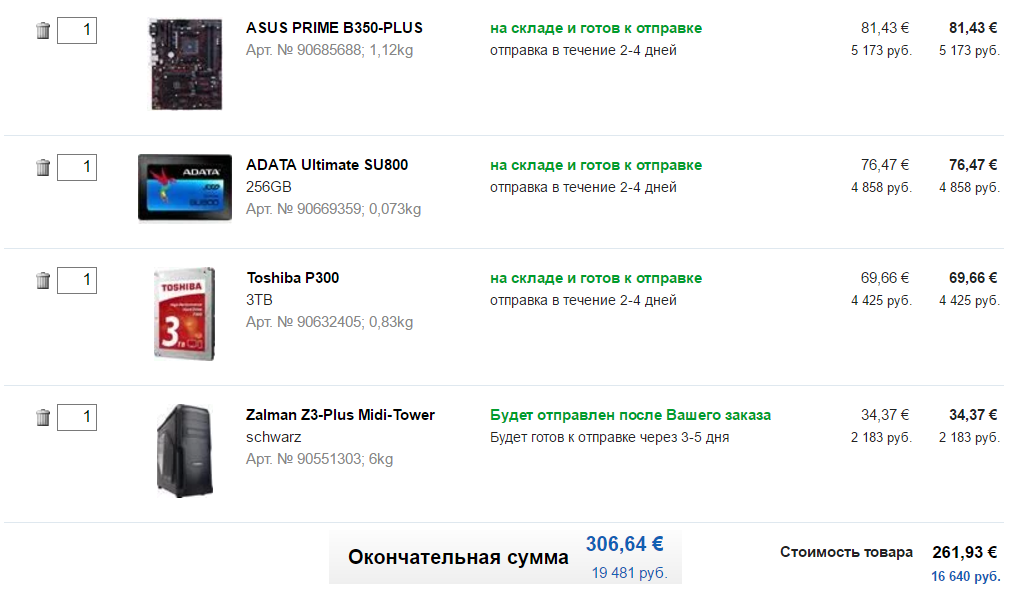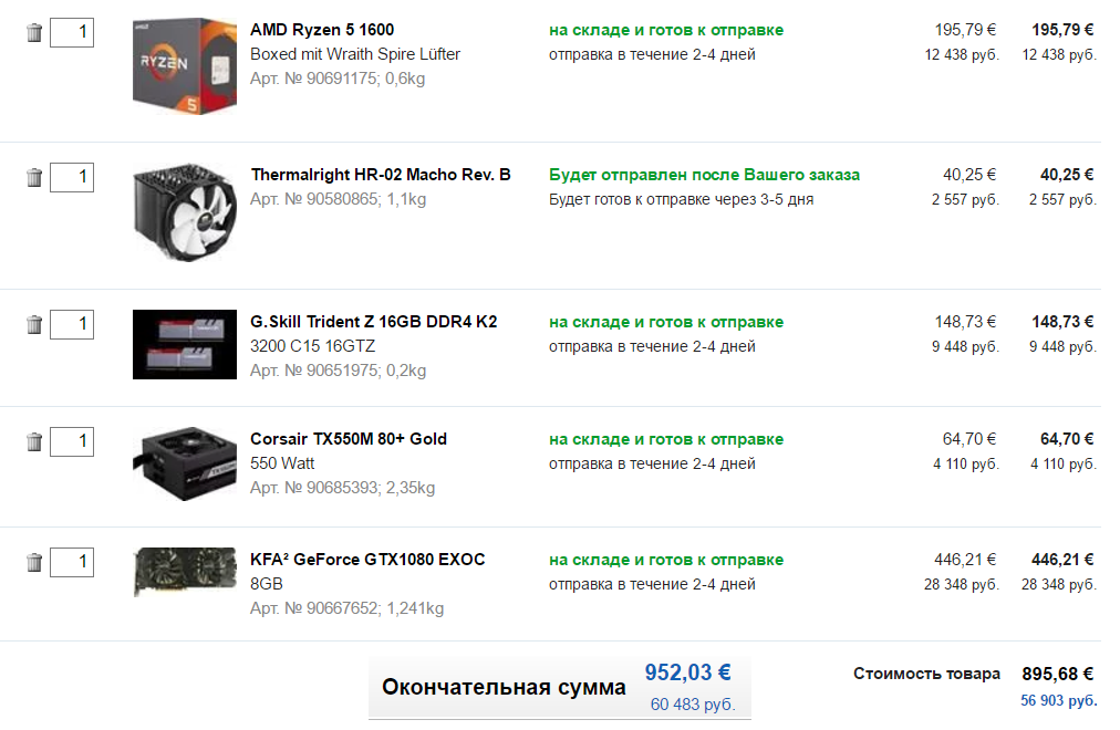 1) Бюджет ~70-80к 2) Линк(и) на прайс магазина(ов), где будете брать систему - computeruniverse 3) Что собираетесь брать: Только системник и мышь 4) Указывайте для каких задач берётся сабж а) Для игровых систем: - Указывайте разрешение монитора и параметры анизотропной фильтрации и сглаживания, которые будут использоваться в играх. 2560x1440p - Указывайте названия игр или хотябы жанры. Ведьмак 3, battlefield 1, rise of the tomb rider 5) Уточняйте планируете ли Вы разгон системы - ДА 6) Уточняйте планируете ли Вы апгрейд системы в ближайшие 6 месяцев - НЕТ 7) Если у Вас есть какое-то железо, которое Вы ещё планируете использовать - НЕТ 8) Если у Вас есть какое либо требования, уточняйте: - AMD Ryzen 5 1600X (иногда будет кодироваться видео, 6-ядерник предпочтителен), GeForce GTX1080, мышь Logitech G900, hdd на 4TB - все комплектующие должны быть с computeruniverse (и всё равно на то, что сумма превысит 1000 евро - заказ будет разделен) - Желательна тихая работа и небольшой корпус (Mini-tower) - Только воздушное охлаждение