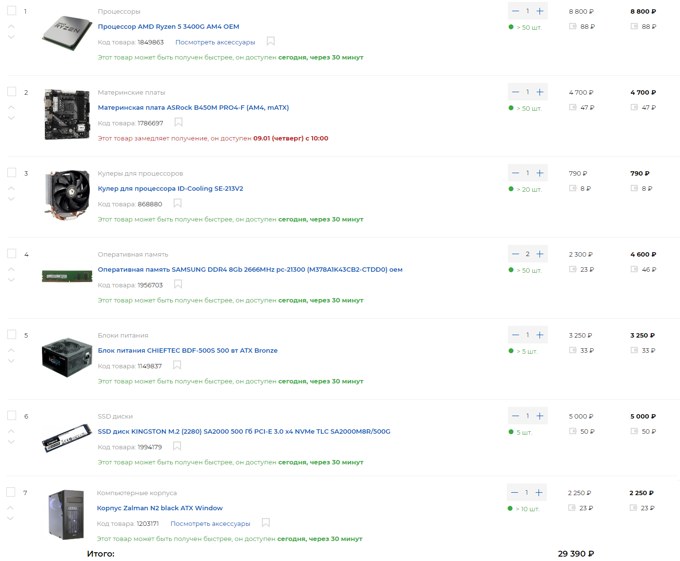 Привет всем! 1. 25к. Предел - 30к. 2. в принципе сойдёт любой магазин в Москве. 3. Только системник. 4. в основном для работы, программа PRO100 проектирование мебели. Монитор - Full HD 5. Нет. 6. возможно докуплю потом недорогую видео карту, если дело будет упираться в неё (но не уверен что программа жрёт видеопамять). 7. Нет, компьютер собирается с нуля, есть только хард , от старого компа, но он будет как файло помойка. 8. 9.https://www.onlinetrade.ru/basket.html? ... 883349c498