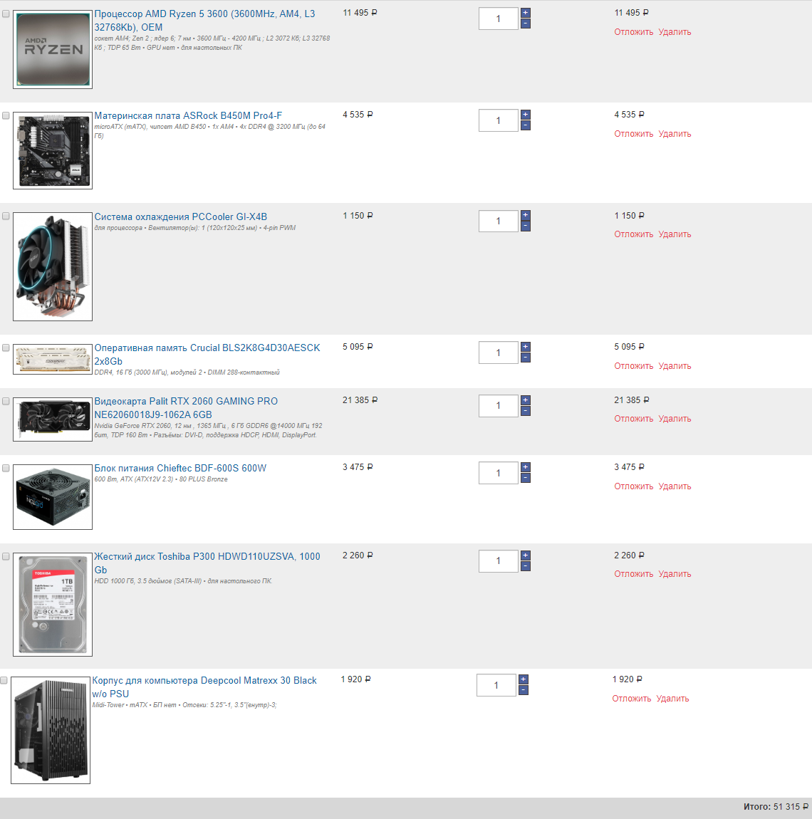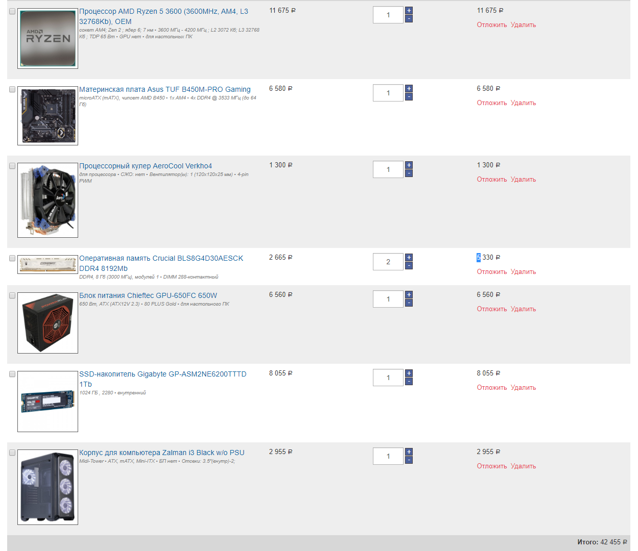 AsRock B450M Pro4-F 4620 р. Chieftec BBS-500S - 3 800 р. DeepCool Matrexx 30 Black - 1910 р. DeepCool Gammax 400 - 1300 р. SmartBuy Splash 512Gb - 3890 р. ОЗУ G.Skill 3200Mhz 8Gb - 2700 Итого: 18520 р.