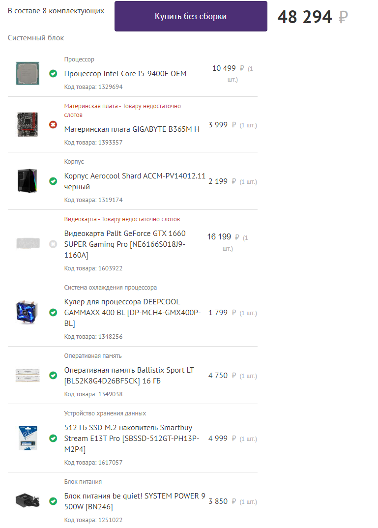 Вечер добрый. 1. Я увеличил бюджет до 50к рублей. 2. Город Новоросийск. Все сетевые магазины у нас есть. 3. Только системник 4. Племянник хочет в игрушки играть, GTA5, CS:GO, и все в этом духе. Имеется монитор Acer V226HQL, разрешение FullHD. Порты на нем VGA, DVI. 5. Разгон не планируется. 6. В ближайшие 3 года апгрейд не планируется. 7. Дополнительного железа нет. 8. Прошу помочь подобрать наилучший вариант по соотношению цена-производительность. По брендам, предпочтительна связка Intel + Nvidia. 9. Посмотрел много роликов на ютубе и статей в рунете, вот что получилось. Ссылка на конфиг https://technopoint.ru/custompc/configu ... ec74e381e/ Как вы смотрите на такой конфиг? Есть предложения что изменить/заменить ? По блок питанию, 500ватт вполне достаточно на такой конфиг? И еще маленькое но, конфигуратор ДНС почему-то ругается, не пойму в чем дело. Глючит может... Посмотрите пожалуйста, все нормально с совместимостью?