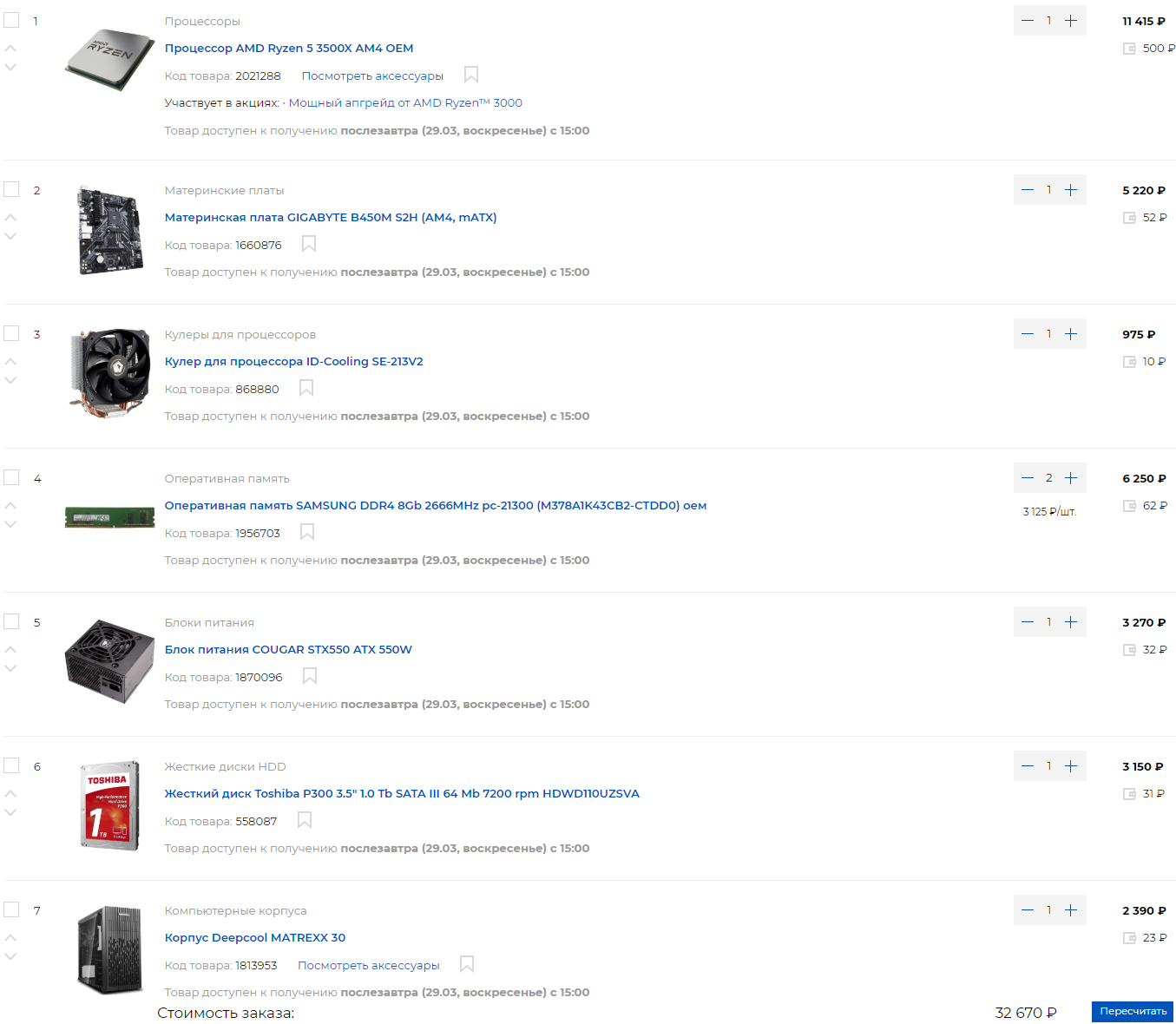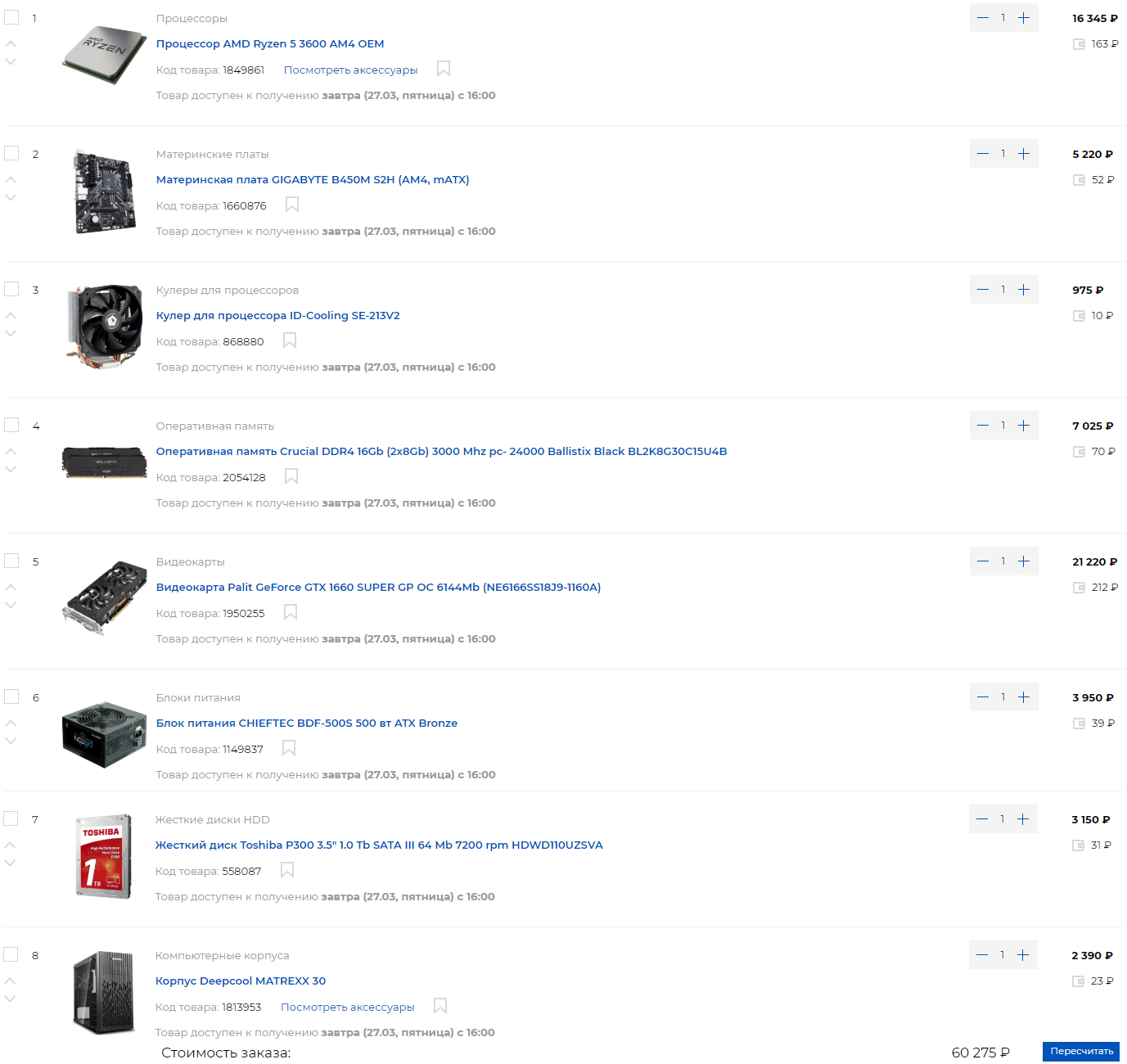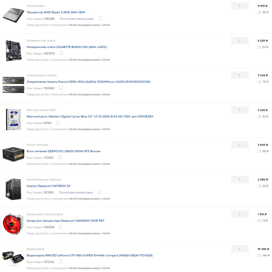 Я бы взял видеокарту с системой охлаждения получше, например NE6166SS18J9-1160A, а SSD на сдачу - PBU120GS25SSDR или CT120BX500SSD1 (чуть дороже). Остальные железки в принципе ОК, учитывая текущий курс.