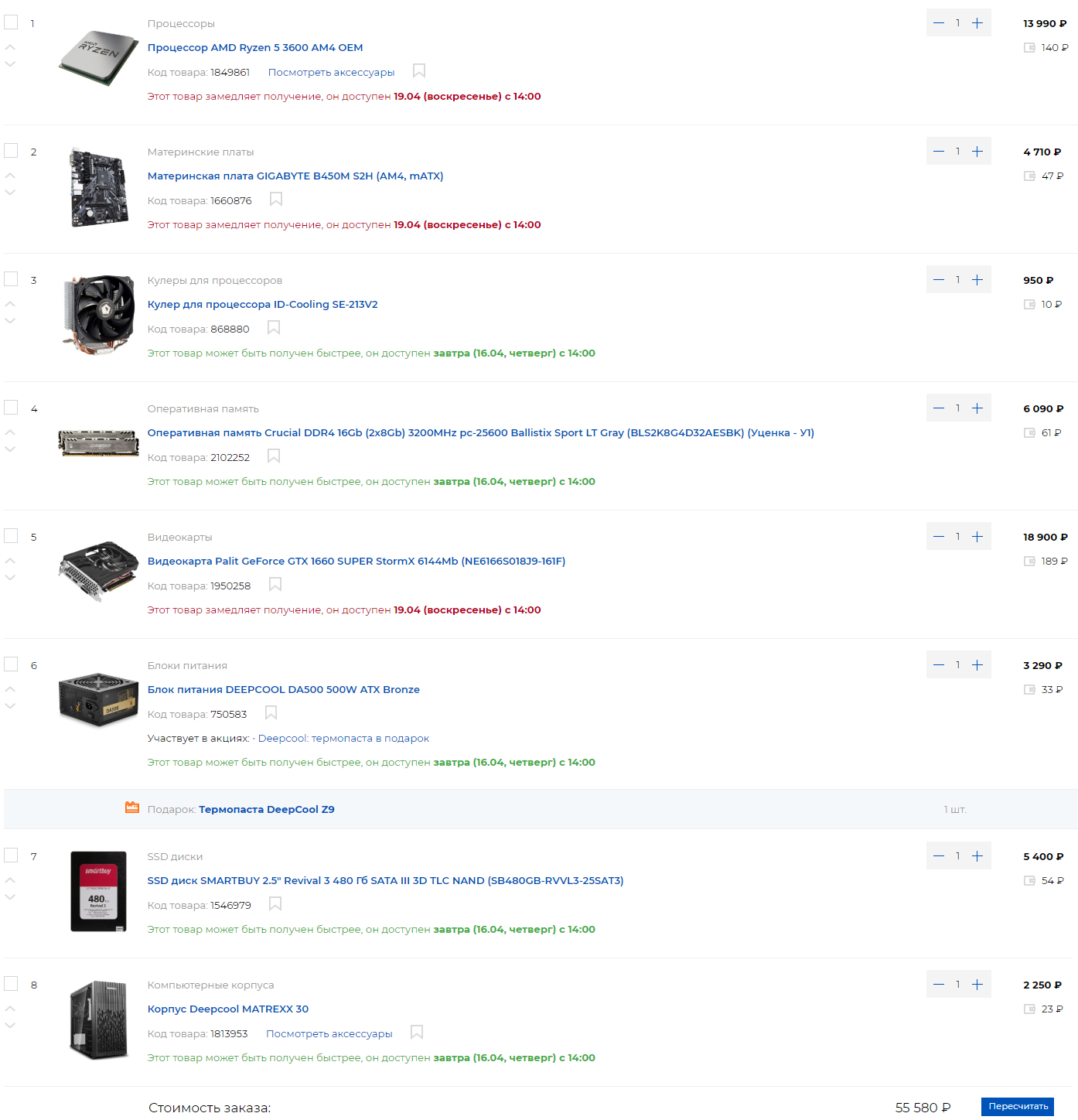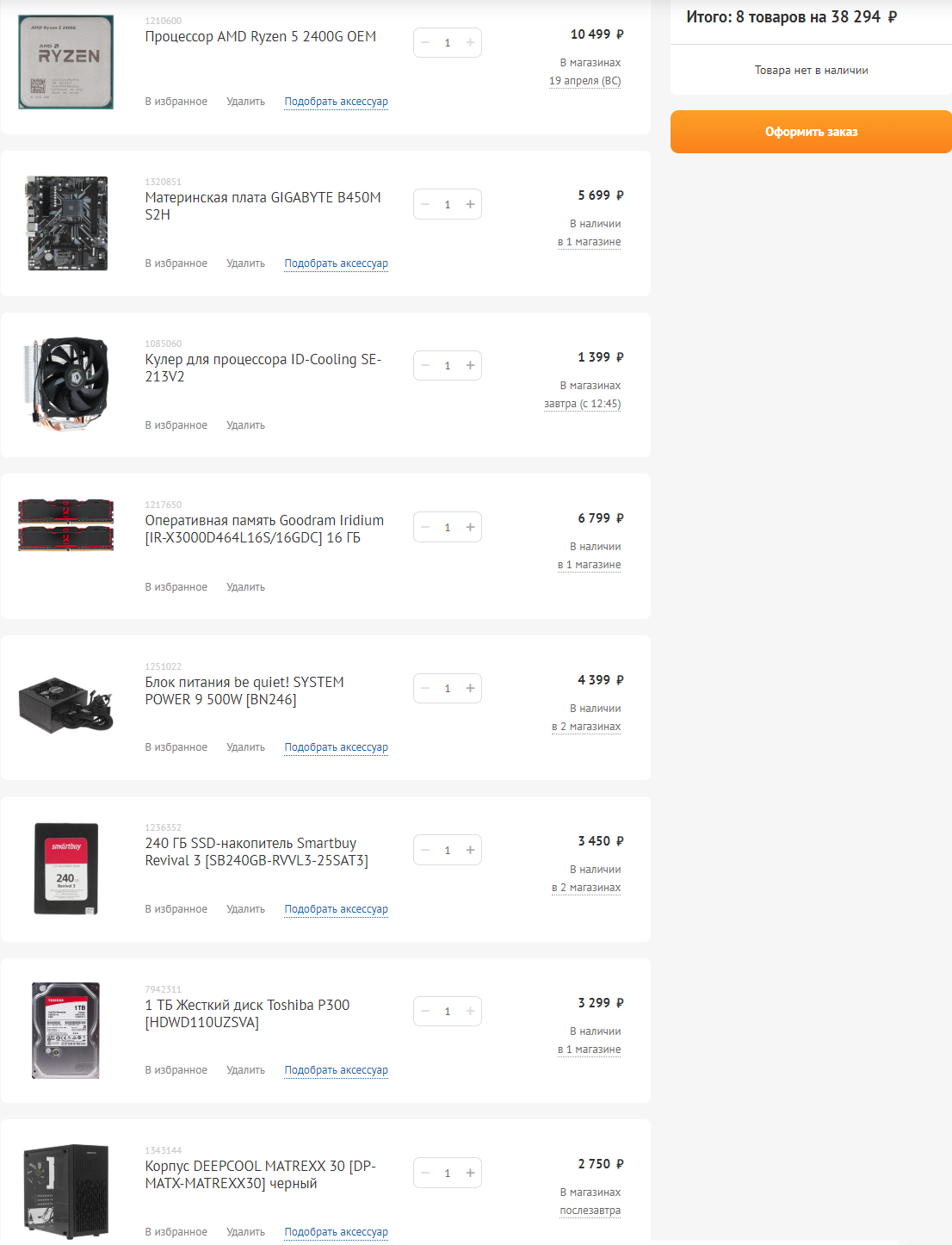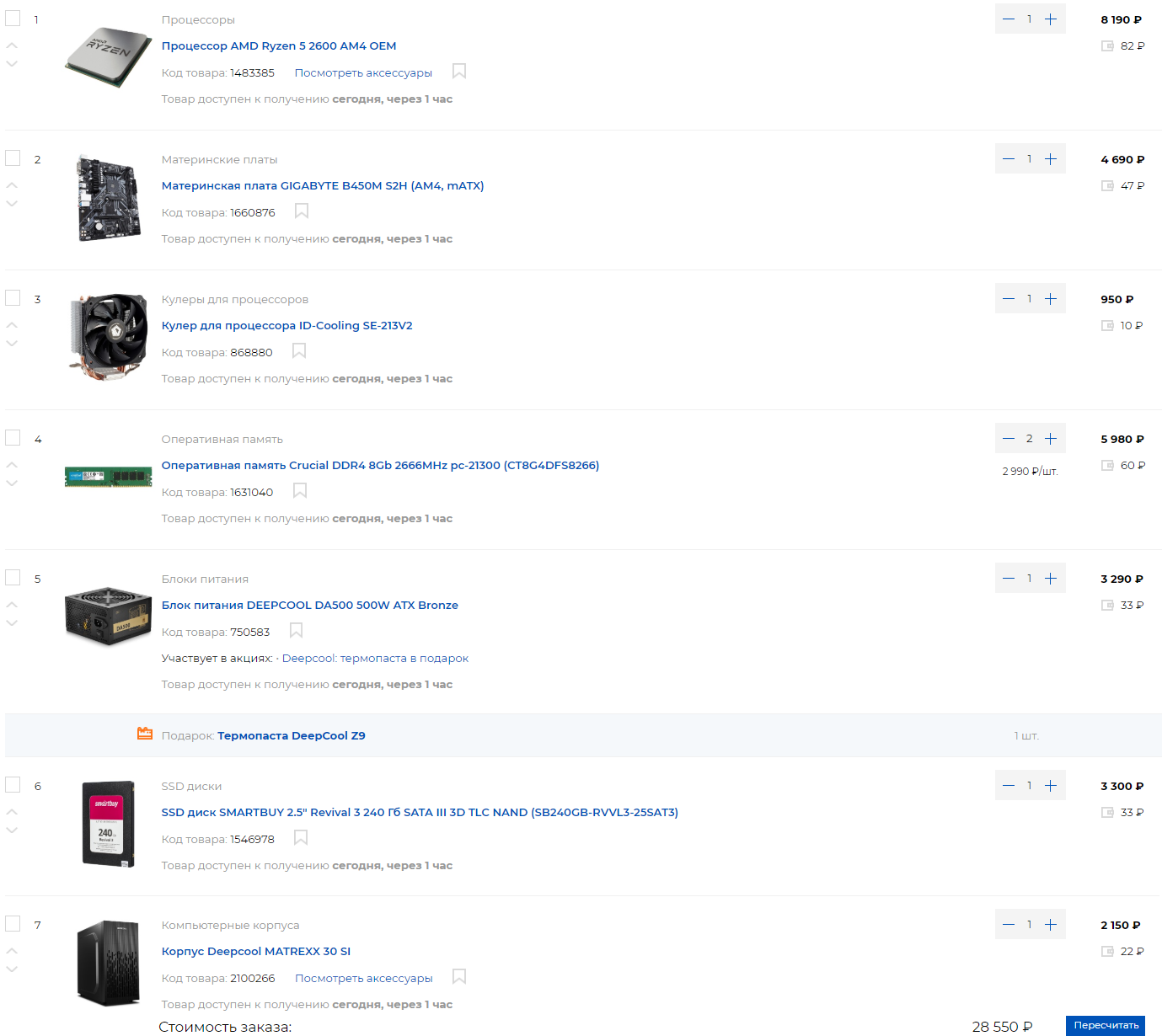 5110 руб. GIGABYTE B450M S2H (RTL) AM4 <B450> PCI-E Dsub+DVI+HDMI GbLAN SATA RAID MicroATX 2DDR4 7139 руб. CPU AMD Ryzen 3 2200G (YD2200C5) 3.5 GHz/4core/SVGA RADEON Vega 8/2+4Mb/65W Socket AM4 3021*2шт. = 6042 руб. Crucial <CT8G4DFS8266> DDR4 DIMM 8Gb <PC4-21300> CL19 5110 руб. Minitower INWIN EFS052U3 MicroATX 500W (24+2x4+6/8пин) 3487 руб. SSD 240 Gb SATA 6Gb/s Silicon Power Slim S55 <SP240GBSS3S55S25> 2.5" TLC 369 руб. ID-Cooling <ID-CPU-DK-01>(4пин,775/1155/AM2/AM4/FM2,14.2-28.8дБ,800-2500об/мин,Al)