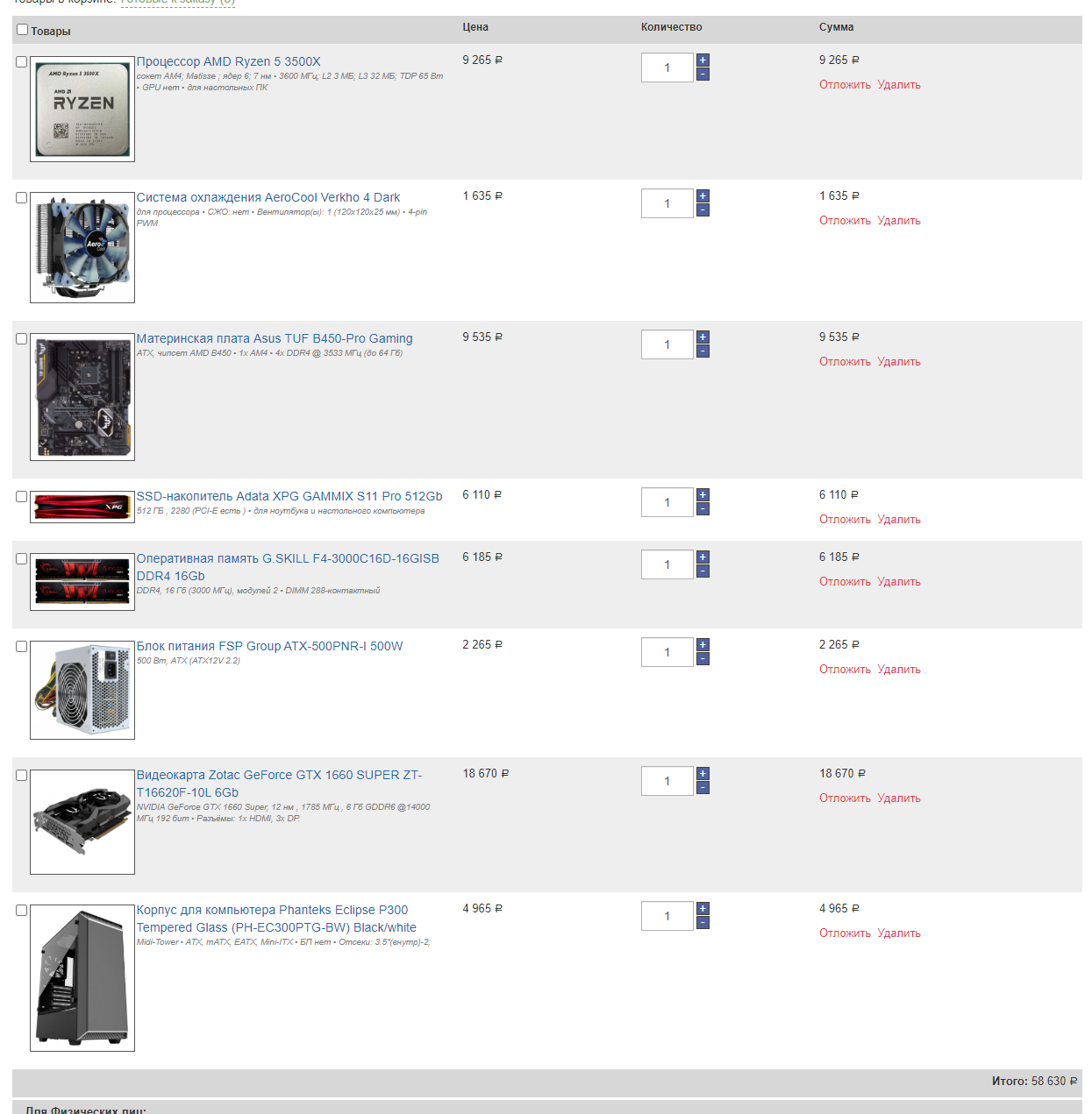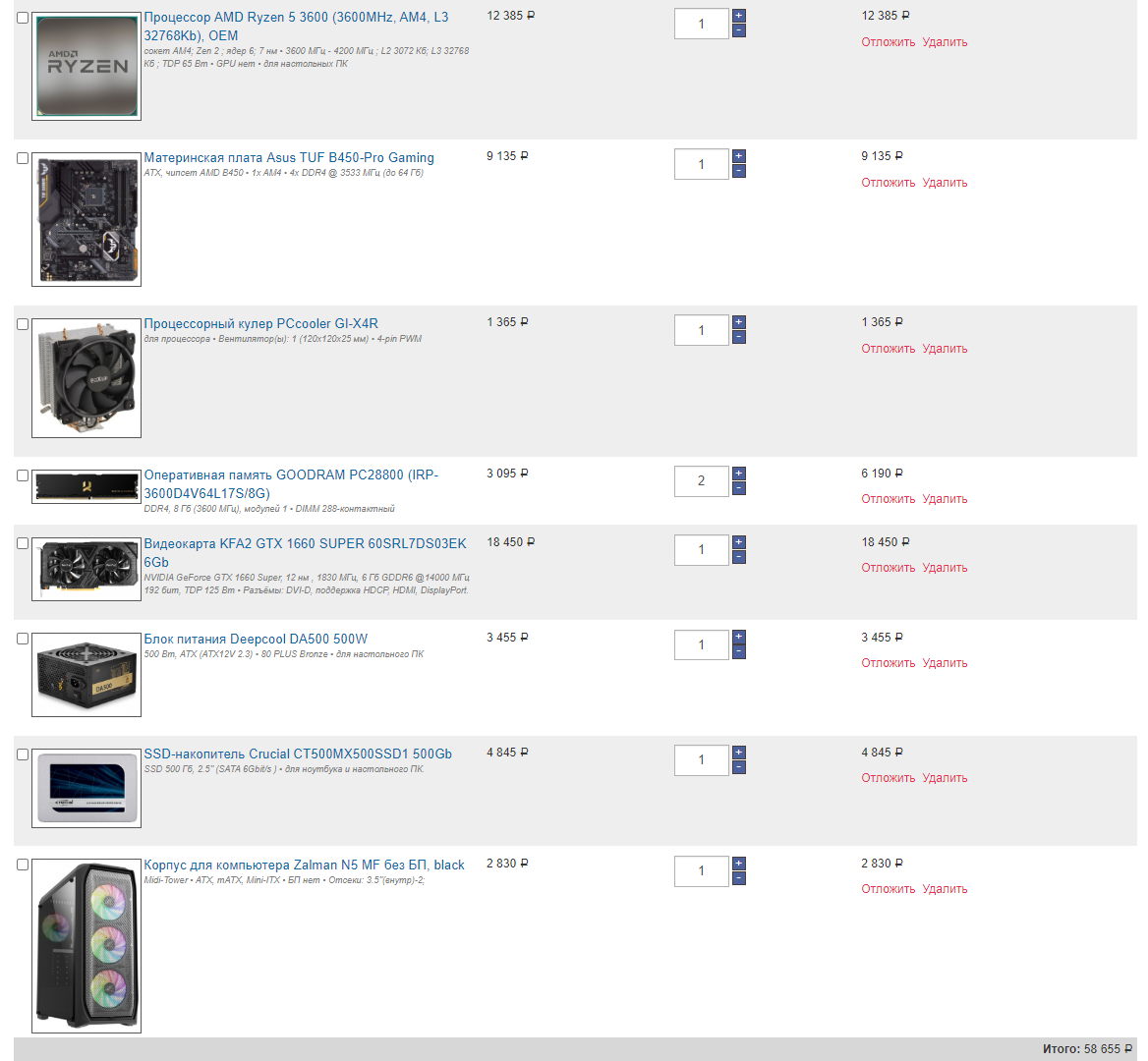 1) Процессор AMD Ryzen 5 2600 OEM 2) Материнская плата: - MSI B450 GAMING PLUS MAX или - ASUS TUF B450-PRO GAMING 3) Видеокарта MSI GeForce GTX 1650 GAMING X [GTX 1650 GAMING X 4G] (нужно доп. питание) 4) Кулер для процессора DEEPCOOL GAMMAXX 400 [DP-MCH4-GMX400] 5) Оперативная память Crucial Ballistix White [BL2K8G30C15U4W] 16 ГБ 6) 1 ТБ Жесткий диск WD Blue [WD10EZEX] 7) Блок питания be quiet! Pure Power 11 600W [BN298] 8) Корпус Zalman Z9 PLUS (3 вентилятора 120*120 в корпусе)