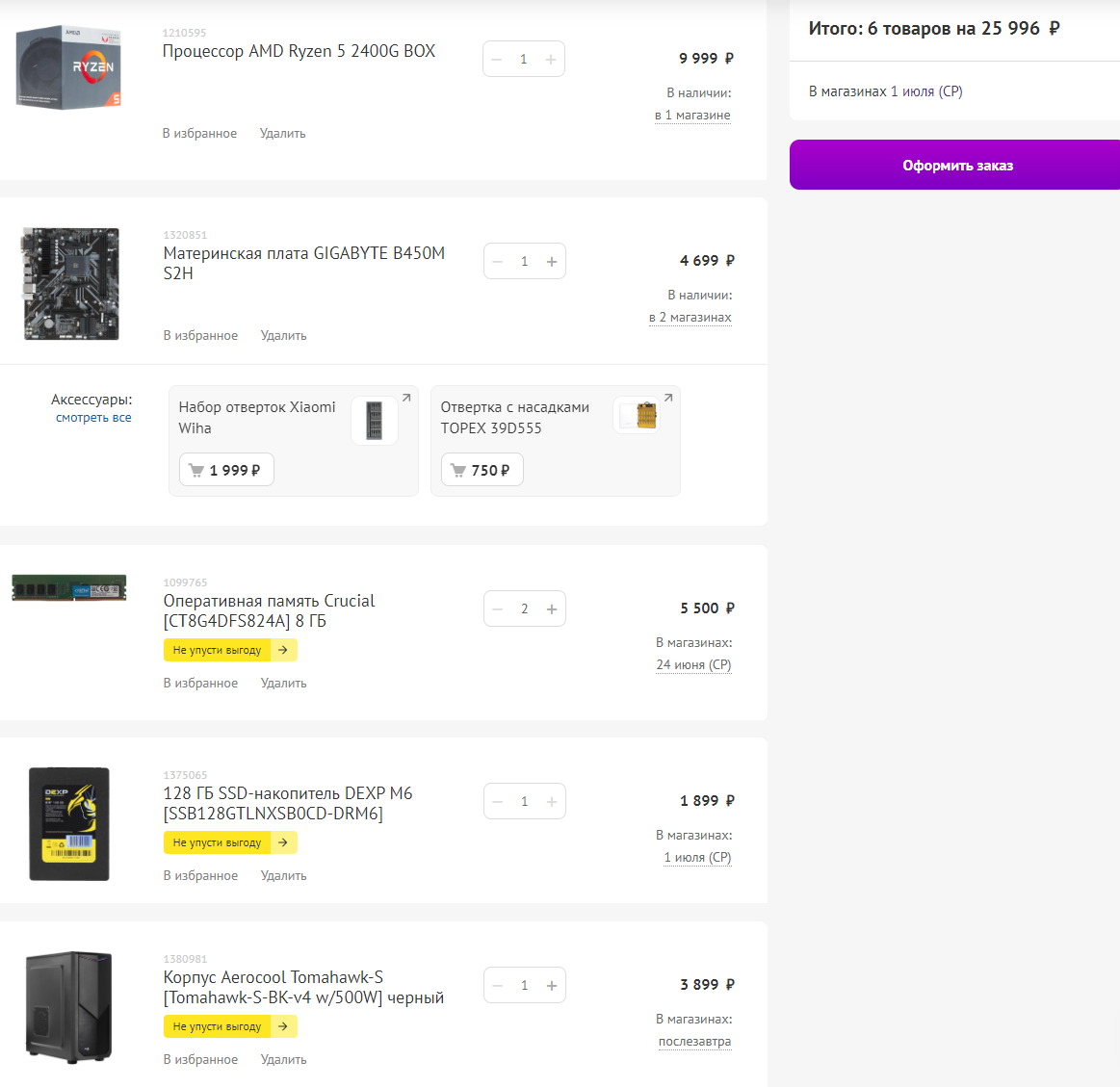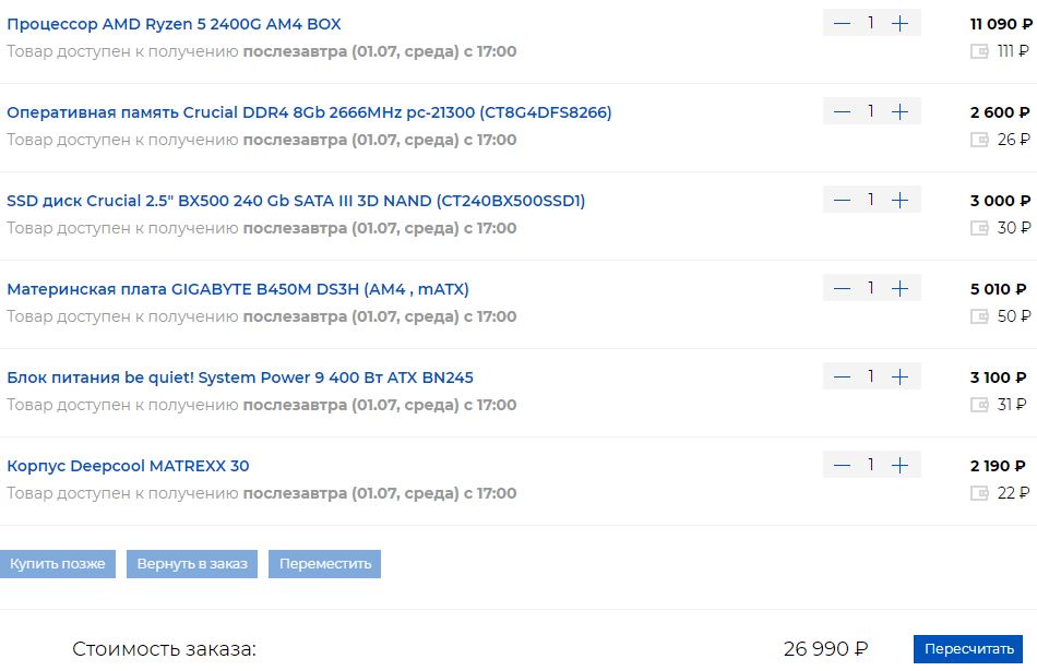 Материнская плата ASRock B450M-HDV R4.0 - 4599 Оперативная память AMD Radeon R9 Gamer Series [R9S48G3206U2S] 8 ГБ - 2799 120 ГБ SSD-накопитель A-Data SU650 [ASU650SS-120GT-R] 1950р Блок питания be quiet! SYSTEM POWER 9 600W [BN247] - 5050р Корпус DEEPCOOL MATREXX 30 [DP-MATX-MATREXX30] черный - 2229р Процессор AMD Ryzen 5 1600 BOX - 8750р Итого 25447. Но тут нет видеокарт..Не влажу в бюджет. Думаю можно взять проц похуже и БП подешевле. Но не хватает скила. Собирал по разным faq.