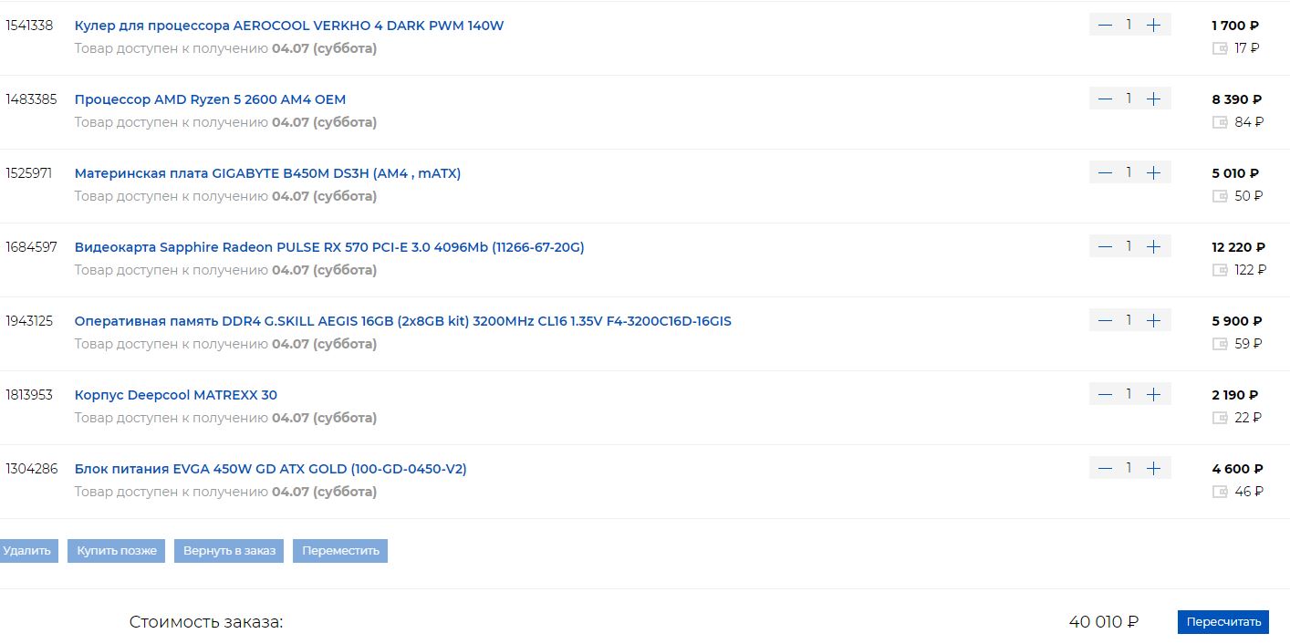 Корпус, бюджетный кусок картона. Хлипкий, без вентиляторов в комплекте и всего 142 мм по высоте кулера (соответственно какой-то более менее серьёзный кулер - до свидания) Блок питания, бюджетный блок с групповой стабилизацией напряжений, посредственными конденсаторами и шумным вентилятором. Вариант из разряда "на безрыбье и рак - рыба" Оперативная память. Смысла нет в 3200Mhz, когда у тебя материнская плата выше 2666Mhz не тянет. Материнская плата. Я, конечно, понимаю, что процессор будет в стоке работать, но брать материнку с такой набортной логикой и такой подсистемой питания, ну как-то так себе вариант. По итогу, всё удешевлено лишь бы впихнуть видеокарту.