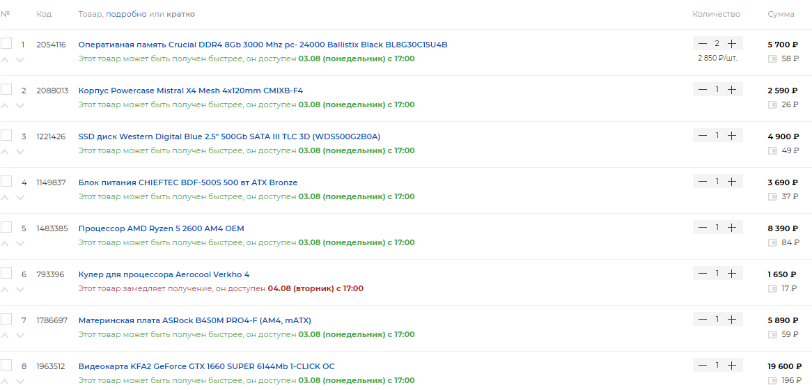 1. Корпус AEROCOOL PGS Streak (Black) 2. Блок питания Chieftec 700W (GPS-700A8) 3. Внутренний жесткий диск Western Digital Blue 1TB 7200rpm 64MB (WD10EZEX) 4. Samsung 970 EVO Plus 250 GB (MZ-V7S250BW) 5. Мать Gigabyte B450M S2H Socket AM4 6. Проц AMD Ryzen 5 3600 (100-100000031BOX) 7. Kingston 16 GB (2x8GB) DDR4 3200 MHz Fury Black (HX432C16FB3K2/16) 8. Видеокарта GIGABYTE GeForce RTX2060 6144Mb GAMING OC PRO (GV-N2060GAMINGOC PRO-6GD)