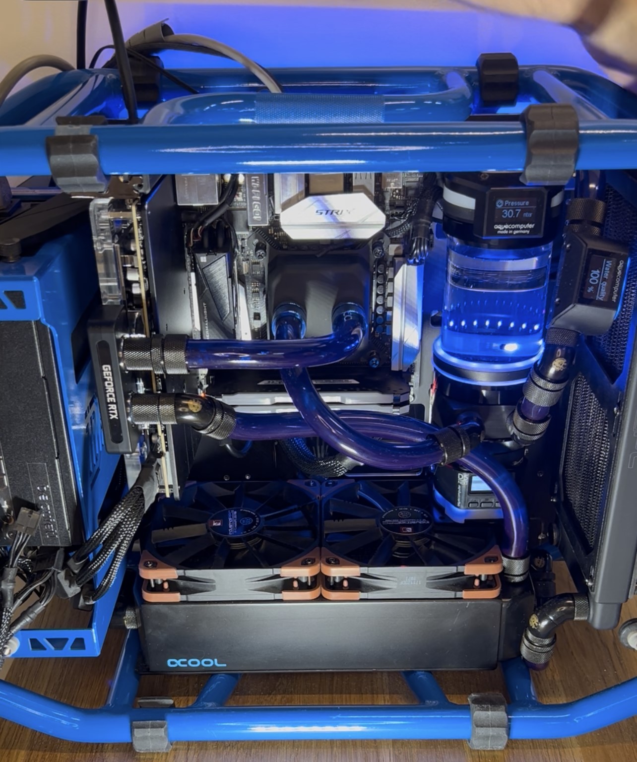 Сходу не могу вспомнить, не подскажите что за модель, просто вот прикидываю: 2х240(один люто толстенный), помпа, резервуар, БП видимо не SFX раз 5090 не проблема... - компактность тут явно не приоритет, может что подобное и свежее есть(все равно по сути все перебирать), а так iTX просто часто оверпрайс и неудобный/ограниченный, скажем на выбранных вами платах один M2 что не всегда удобно(кстати вы свои накопители не указали)