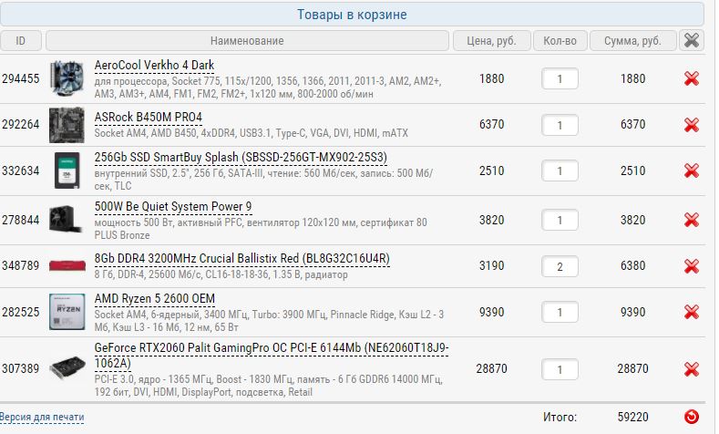 JadeStar я пока с телефона, не удобно сайтам ползать, посмотри такую конфигурацию (если что, можно поменять некоторые позиции в зависимости от бюджета): Ryzen 5 3600 AsRock B450M Pro4 (Pro4-f) Crucial BallistiX BL2K8G30C15U4R x2 be.quiet Pure Rock 2 PowerCase Mesh x4 или Zslman N5 OF Kingston KC600 512Gb Chieftec BDF-500S KFA2 GTX 1660 Super 1-Click