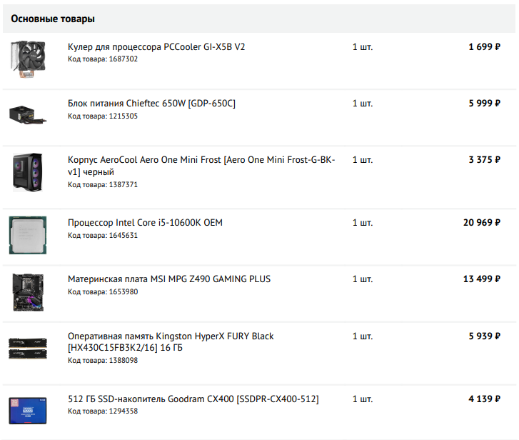 Legion200 ну вот, уже лучше. По системному блоку: 1. Процессор Ryzen 5 3600 2. Материнская плата AsRock B450M Steel Legend 3. ОЗУ Crucial BallistiX BL2K8G30C15U4B x2 4. SSD Kingston KC600 512Gb 5. Блок питания Chieftec BBS-600S 6. Корпус Powercase Alisio Mesh M3 7. Кулер Deepcool Gammax 400 Blue 8. Видеокарта GeForce Palit GTX 1660 Super GP OC Итого: 61 253 р. по магазину xpert. Остатки на монитор.