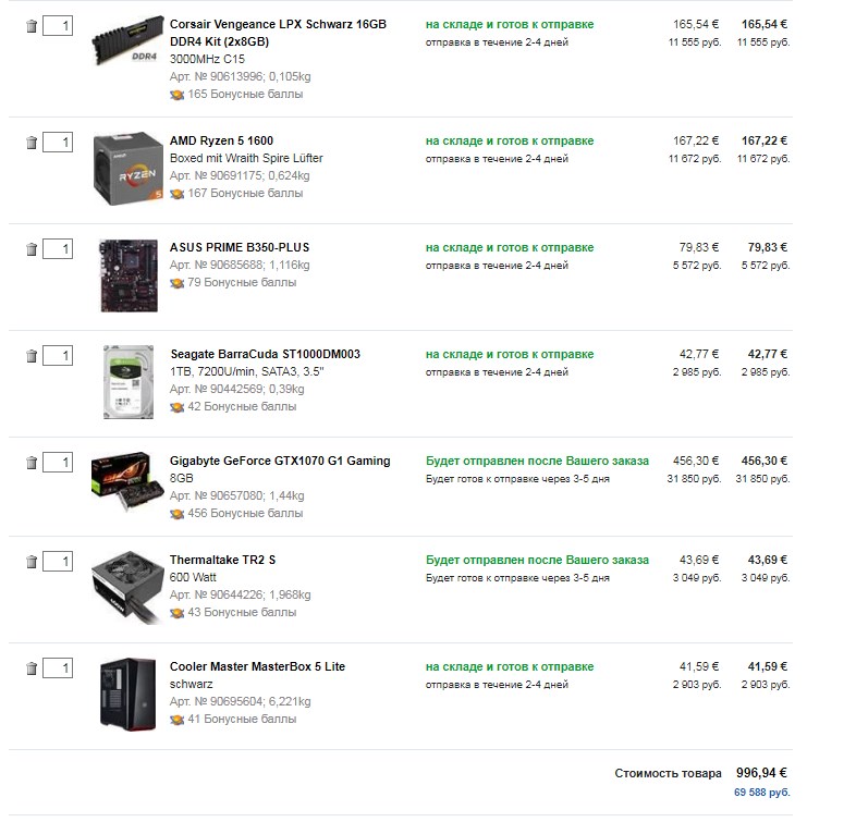 250GB Samsung 960 Evo - примерно € 120 (сейчас он там дороже, видимо перед рождеством цены штормит) 500 Watt be quiet! Pure Power 10 Non-Modular 80+ Silver - € 58,70 Zalman R1 - € 49,47 AMD Ryzen 5 1600 Box - € 191,80 16GB G.Skill RipJaws V DDR4-3200 DIMM CL16 Dual Kit - € 179,90 MSI B350 TOMAHAWK - € 91,17 6GB Gainward GeForce GTX 1060 Phoenix Golden Sample - € 294,29