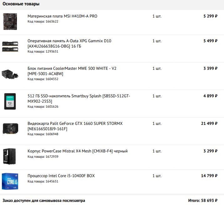 1) 60 000 р. 2) Москва, e-katalog.ru (just.ru, https://topcomputer.ru/, https://www.dns-shop.ru/) 3) Только системник 4) Современные игры (в основном шутеры типа КоЛды), работа в офисных приложениях Имеется монитор, G 23MP57HQ-P, старый добрый, устраивает. HDMI, VGA (D-Sub), 1920x1080 (16:9) 5) Разгон не планирую 6) Апгрейд не планирую 7) - 8) Хотелось бы карту 1660 Super и SSD. По всем остальным компонентам предпочтений нет. 9) У меня был в планах такой конфиг. Но он за последние 3 месяца вылез глубоко за бюджет. Можно ли как-то удешивить такую сборку?