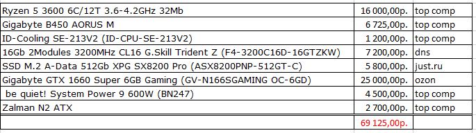 Дублирую текстом Ryzen 5 3600 6C/12T 3.6-4.2GHz 32Mb Gigabyte B450 AORUS M ID-Cooling SE-213V2 (ID-CPU-SE-213V2) 16Gb 2Modules 3200MHz CL16 G.Skill Trident Z (F4-3200C16D-16GTZKW) SSD M.2 A-Data 512Gb XPG SX8200 Pro (ASX8200PNP-512GT-C) Gigabyte GTX 1660 Super 6GB Gaming (GV-N166SGAMING OC-6GD) be quiet! System Power 9 600W (BN247)