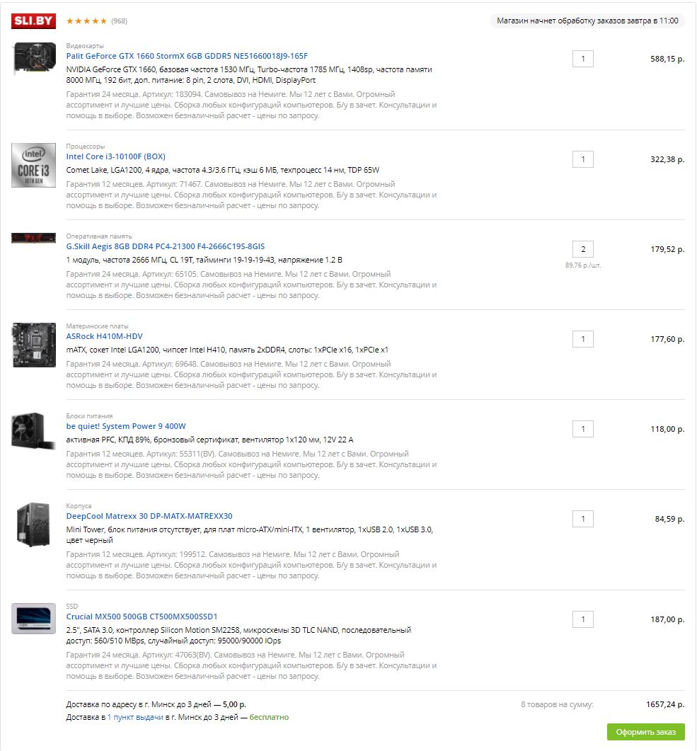 ой это будет долгая песня, вы, видимо не знаете специфику беларуси, у нас народу мало а на складах еще меньше, если выбирать по интернету и звонить - в 9 из 10 случаев этого не будет и надо ждать недели 2-3 пока привезут, причем это опыт предыдущих сборок, а сейчас с этим карантином вообще хз. Сегодня новость прошла что беларусь закрывает въезд через границу в связи тип с ковидом. Да и ждать 3 недели времени у человека нет (это который попросил помощи в подборе компа), так что надо помощь в том чтоб скинуть конкретные ссылки из того что есть на магазинах, либо отдельно по компонентам, либо вариант комплектушки в сборе. Магазинов белорусских я там накидала.