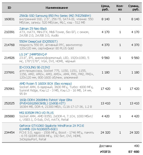 i5 8400 14т Gigabyte Z370P D3 7 т самая дешоВая Corsair VS 550W 3500 т лучше брат дороже, дешовые ломаются ZALMAN Z3 PLUS 3250 т корпус тоже Zalman CNPS10X Optima 1860 т Gigabyte GeForce GTX 1060 20 800 т Corsair Vengeance RGB 16 ГБ 15 т