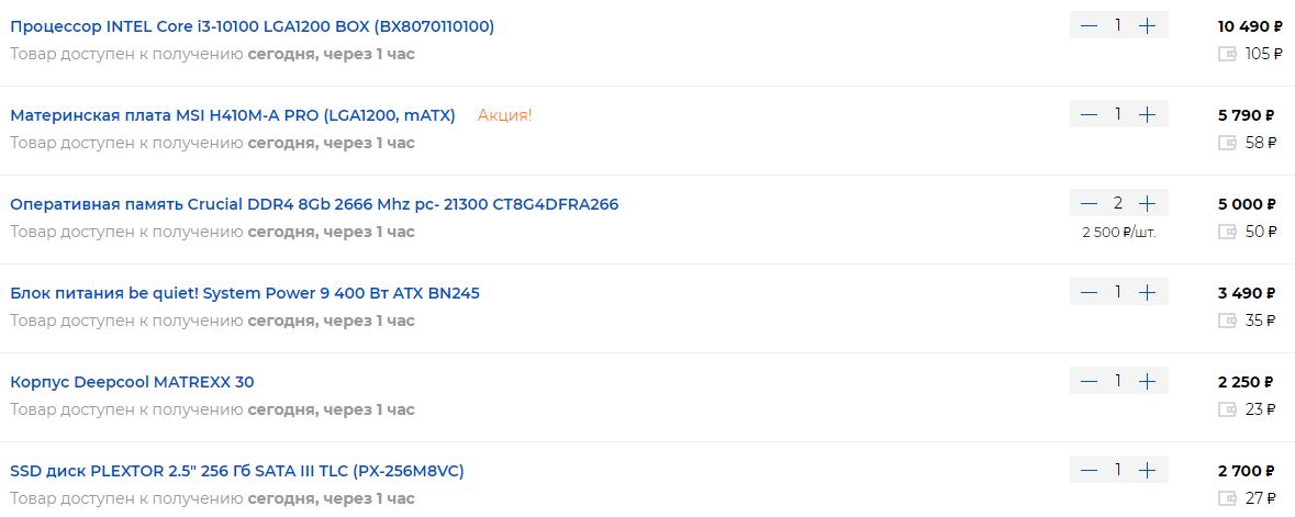 1) до 30 000 р. 2) г.Москва, любой магазин (regard.ru, citilink.ru, dns-shop.ru и т.д. не принципиально) 3) только системник 4) для учебных целей (MS офис, photoshop, прочих учебных программ, возможны простые игры, прослушивание музыки/ просмотр видео). 5) разгон системы - не планируется. 6) апгрейд системы в ближайшие 6 месяцев - не планируется. 7) компонентов для вставки нет (нужен системник с нуля) 8) 8.1.) Брендовая принадлежность не имеет значения, если возможно то прицел на производительность. 8.2) размеры блока - очень желателен минимум. Mini-Tower или Slim Desktop горизонтальный (типа Lenovo ThinkCentre M630e Tiny 10YM0019RU) или вертикальный (типа Lenovo IdeaCentre 3-07 90MV005BRS) - не имеет значения 8.3.) требований по шуму - нет. 8.4.) нужен Wi-Fi-модуль 8.5.) нужен SSD (512 Гб - желательно, но возможно и 256 Гб) 8.6.) Оптический привод, кардридер - не нужны 8.7.) Операционная система - не нужна 8.8.) желательно 16 Гб оперативы и дискретное видео (т.к. наверняка появятся простые игры, школьники же..) по п.8.8. не уверен что необходимо, прошу Вас, как спецов, оценить адекватность. 9) Набросков конфигурации ПК не делал, смотрел готовые https://www.regard.ru/catalog/tovar367220.htm https://www.regard.ru/catalog/tovar371989.htm но подумал, может быть можно собрать подобное с более высокими характеристиками.