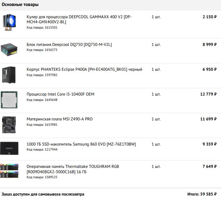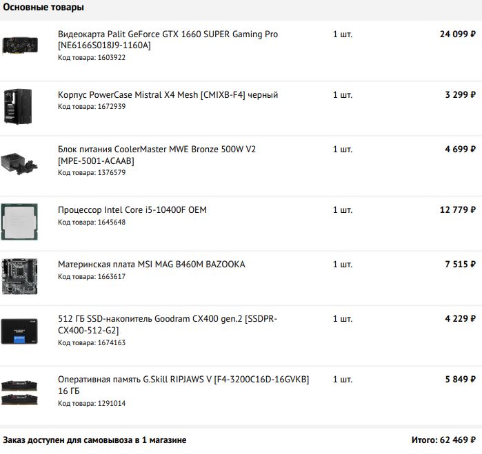 Процессор Intel Core i5-10400F OEM (встроенный GPU в сущности не нужен, поэтому экономлю; К-функционал не нужен ибо все равно буду думать в сторону покупки более мощного камня, если уж дойдет до этого дело, чем заниматься разгоном) Система охлаждения Thermalright Macho X2 (у меня сейчас такой же, но постарее, устраивает на все 110%, поэтому пошел по проверенному пути) Материнская плата Asrock Z490 PHANTOM GAMING 4 (Z-взял на случай если все же возьму камень помощнее и с К... если есть возможность без потери качества сократить расход раза в 2 на мамку, отказавшись от функционала разгона, в сущности я не против) Оперативная память ADATA XPG SPECTRIX D80 RGB AX4U360038G18A-DR80 2х8Gb (кто-то советовал смотреть именно в сторону 3600 версии, с возможностью позже докупить еще такой же кит и увеличить до 32) Видеокарта Palit PA-GTX1660SUPER GP OC NE6166SS18J9-1160A 6Gb (меньше имхо не имеет смысла) Блок питания Блок питания Corsair CP-9020196-EU 850W (взял по аналогии с тем которым пользуюсь на нынешнем компе)