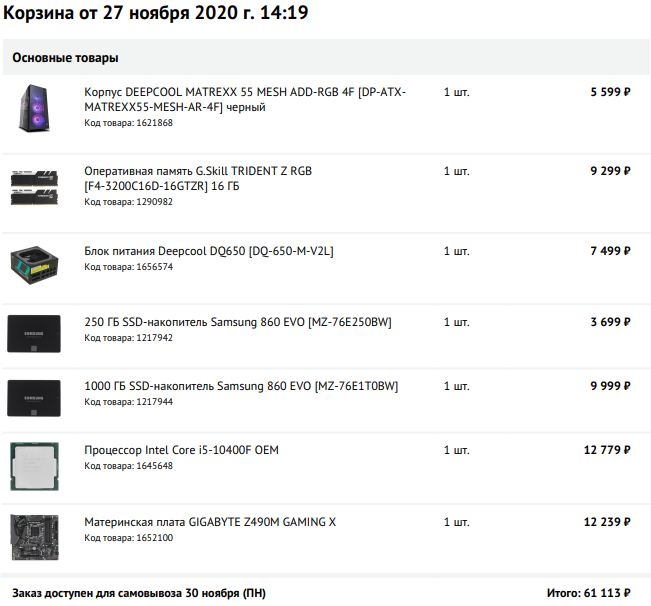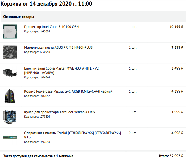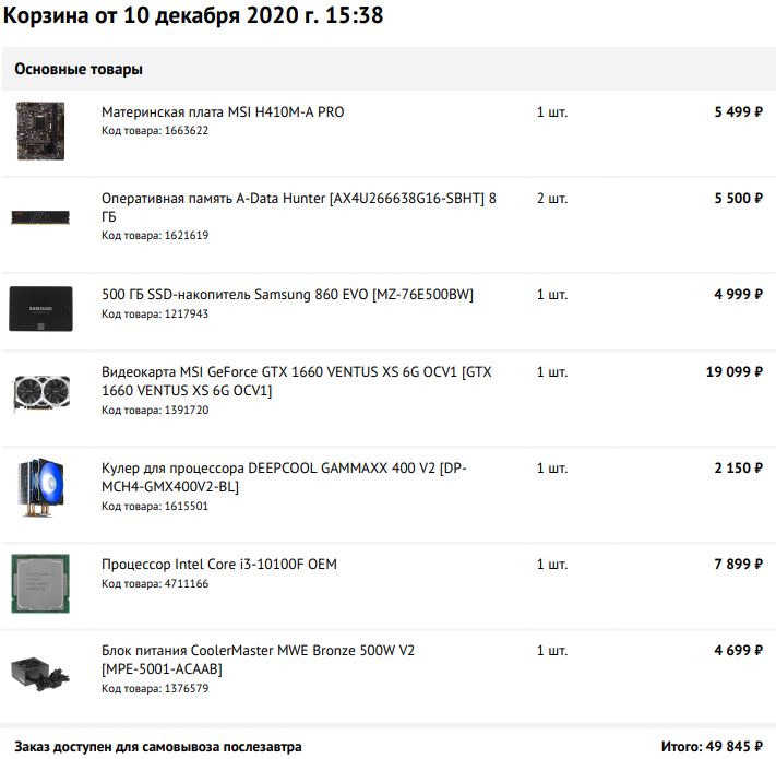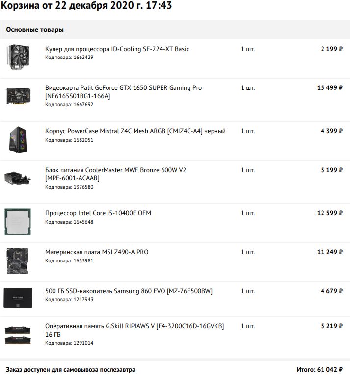 Видеокарту не стал включать в сборку, встроенная в процессор прекрасно справится с этим, но, если прям нужно, то можно и взять. БП полупассив, без нагрузку, в общем-то в данном случае будет вообще работать в пассивном режиме. Всё остальное из разряда "поставил и забыл". Корпус на вкус и цвет, можно подобрать что-то своё. Для удобства собирал в одном магазине.