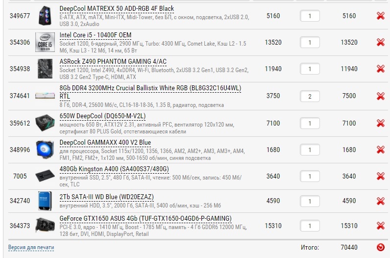 Legion200 в принципе норм: regard > ДНС (выгодные комплекты), будет дешевле AsRock Z490 Phantom Gaming 4/AC > Gigabyte Z490 Gaming X/MSI Z490-A Pro Deepcool Gammax 400 V2 > SE-224-XT Basic Kingston A400 480Gb > WD550 Blue HDD 2Tb, если нужен, то фиг с ним. Но будет шумным.