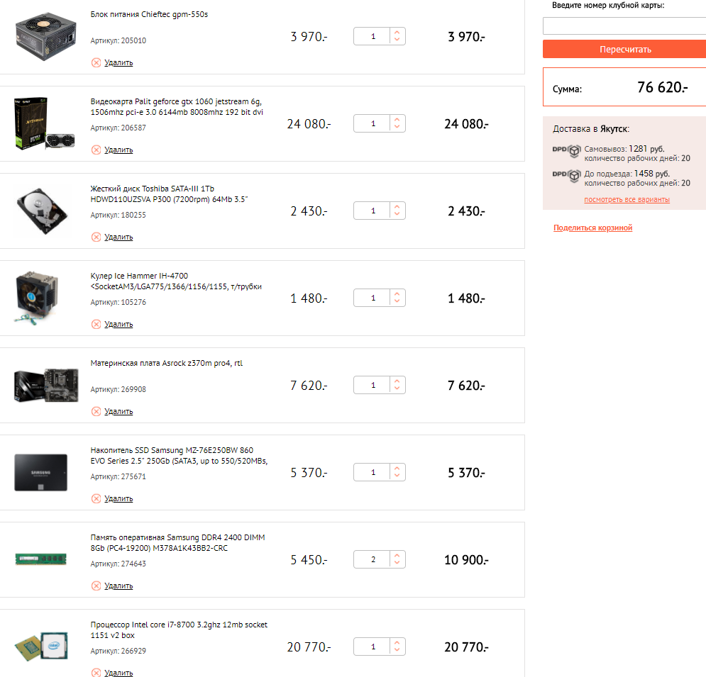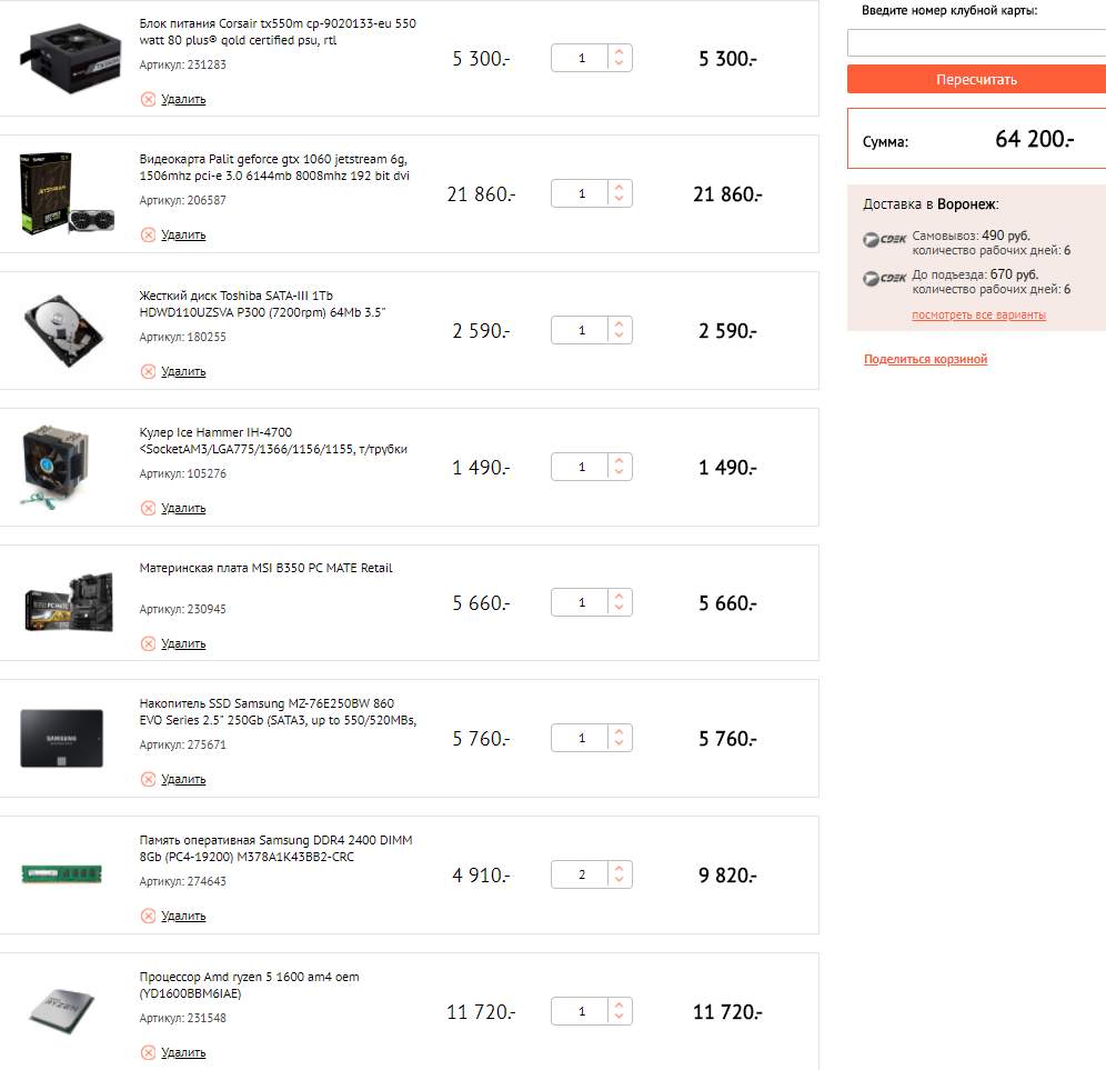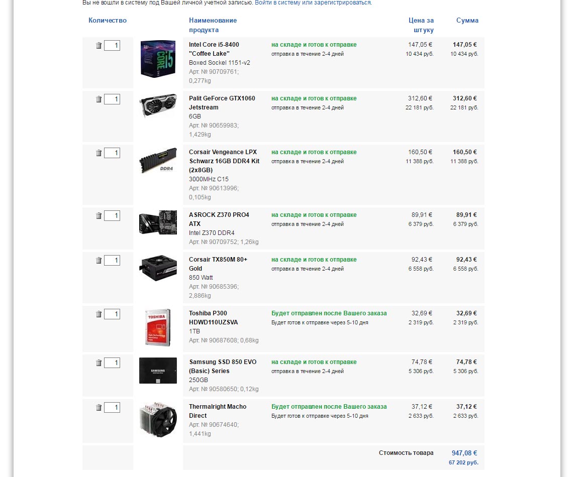 Ваша сборка под ризен, а я пытался собрать под интел. Посмотрел я на цены в росмагазах и пошел на computeruniverse )) проц выбрал i5-8400, позже заменю на i7-8700. Карта будет улучшена до gf1080. В собранной сборке сомневаюсь в правильном выборе памяти, сисохлаждения и блока питания (меньше по ваттности не было, а из других фирм не знаю что выбрать на 550-600 ватт). Также есть матплаты от других производителей, но с точки зрения обывателя они все одинаковые )) как вам сборка?