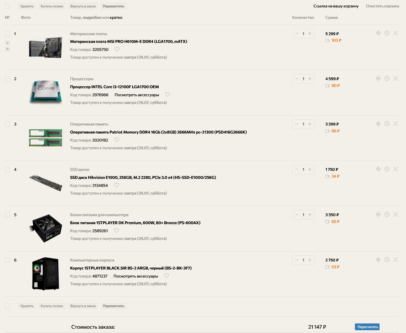 Вот что получилось у меня: Процессор AMD Ryzen 5 5600, OEM (хотел R5 5500, но решил, что 5600 для игр лучше) Материнская плата Gigabyte B550M K (изначально простая плата была, но всё-таки поддержка PCIie 4.0 показалась важной) Устройство охлаждения(кулер) Formula Ice Boid 3PSD9, 4-pin, черный Видеокарта Gigabyte NVIDIA GeForce RTX 3060 GV-N3060WF2OC-12GD 2.0 Оперативная память A-Data AD4U32008G22-SGN DDR4 — 1x 8ГБ (2 планки по 8 Гб, итого 16 Гб) SSD накопитель A-Data Legend 710 ALEG-710-1TCS 1ТБ Корпус mATX Accord ACC-263B, черный (самый дешевый корпус, что бы просто был) Блок питания Thermaltake LT-650P, 650Вт, черный