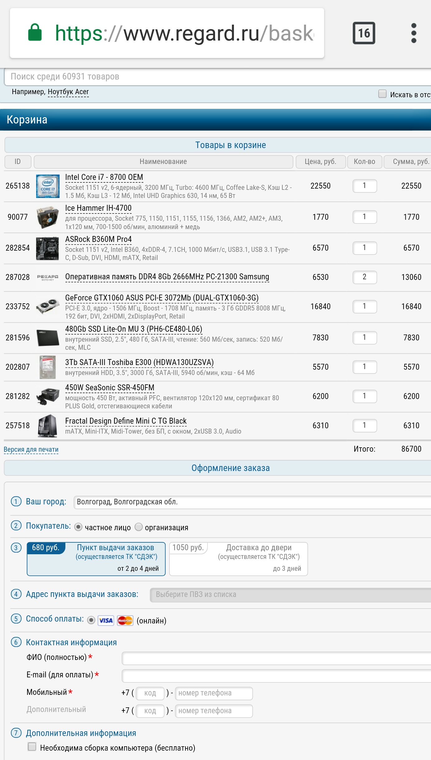 1) Бюджет 60.000 - 80.000 2) https://www.regard.ru/ , Москва 3) Ситемник и монитор 4) Собирается все это дело в офис (photoshop, офисный софт, легкие базы данных), но и поиграть в свободное время должно быть на чем 5) Нет 6) Нет 7) Нет 8) а)Монитор должен быть 24", с хорошей цветопередачей, как можно тоньше ну и чтобы глаза за целый день не превращались в омлет) б)Системник должен быть самый обычный (его не видно), никаких подсветочек и финтифлюшек, желательно компактным. в)На системнике должны быть фронтальные usb (4 шт мин.) г)Шумопроизводительность системы - важный фактор, она должен быть на минимальном уровне д)Наверное, есть смысл полностью отказаться от HDD (из-за шума) и остановиться на SSD 500гб, этого объема будет достаточно... Не стоит забывать, что коробка будет стоять в офисе и если в один день все это №"#@ (сломается) - это будет фиаско... Не знаю, как этого не допустить