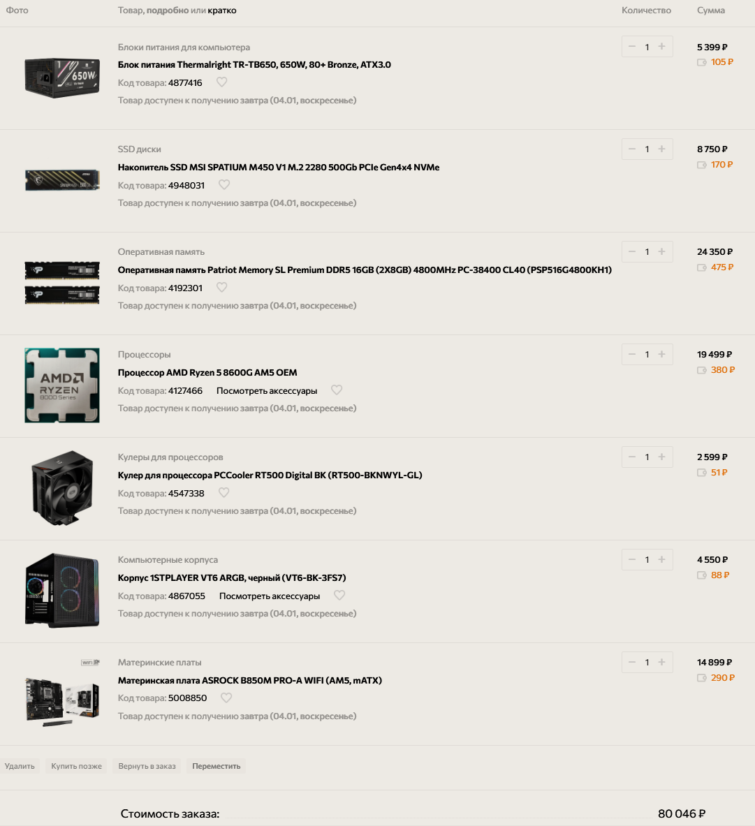 Лови alexzein110 : http://www.dns-shop.ru/cart?share=88f32 ... a7b5bbab2a 12600KF/16DDR4/5050/512GBSSD + материнская плата и система охлаждения которая в 14600K может. Я бы так собрал, эта сборка на порядок лучше будет, ну а SSD 1TB это не обязательный параметр, а вот нормальный процессор, материнская плата которая и 14900K может, хорошая башня которая 14600K вытянет на два щелчка, вот это обязательное, а SSD он потом себе докупит, хоть на 100 TB, главное под систему есть и ПК работать будет намного веселей.