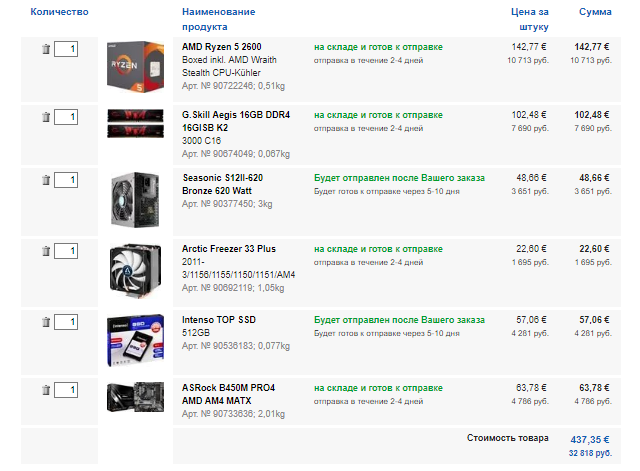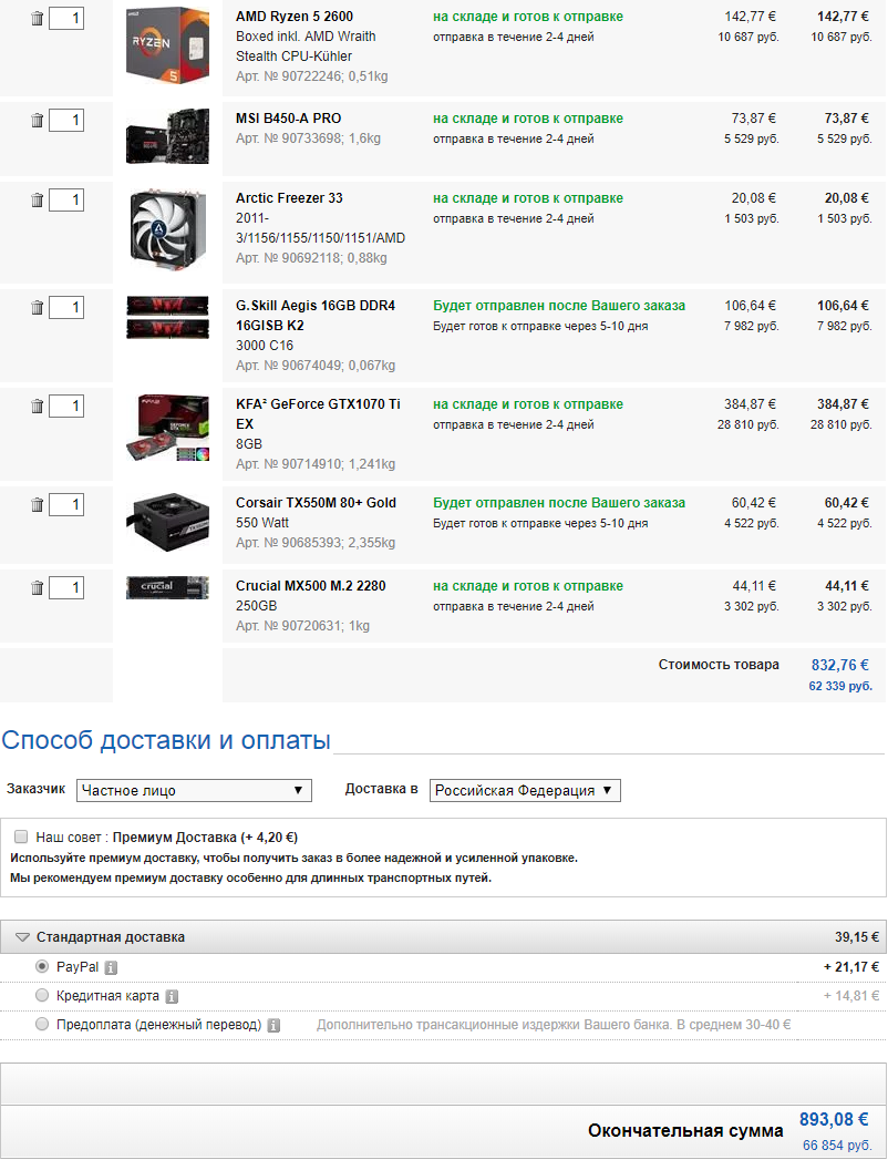 AsRock Z370 Extreme4 ( с компьютерЮниверс ) i7-9700K (с амазона, за $400, уже 5 дней висит ордер, жду еще неделю, если так и не появится в наличии буду думать между i5-8600K vs i7-8700K) Samsung SSD 970 Evo M.2 (с компьютерЮниверс) блок питания Thermaltake Smart RGB 600 Watt (компьютерЮниверс) кулер Thermalright HR-02 Macho Rev. B (комп.Юниверс)