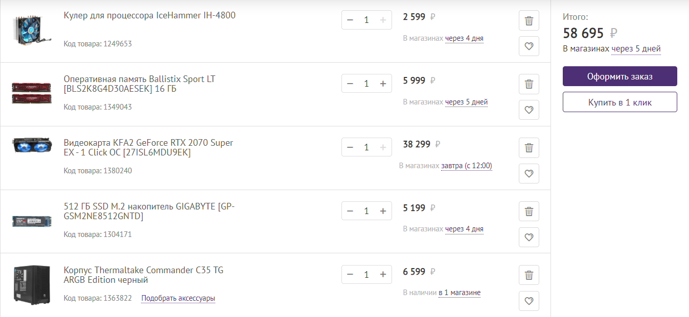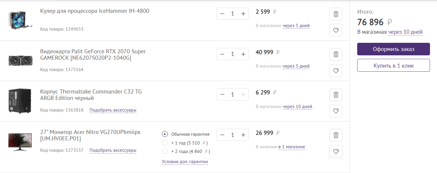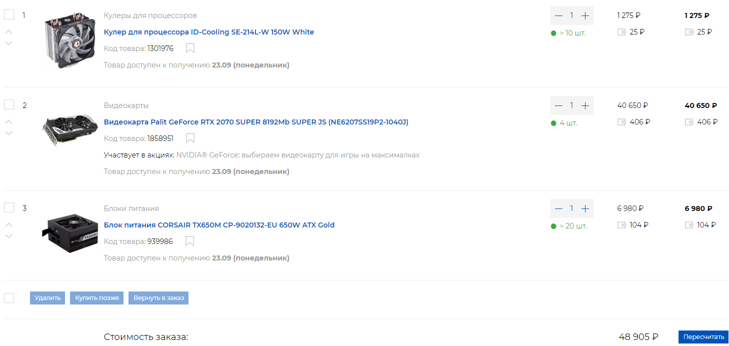 Итого 104000 рублей. Видеокарта выбрана усредненной цены 2070 супер. Небольшой запас бюджета позволяет выбрать 2070 супер с оптимальной системой охлаждения. Так же по кулеру, не думаю, что нежна дорогая ноктуа с учетом того, что процессор гнать не буду да и выбран не разгоняемый.